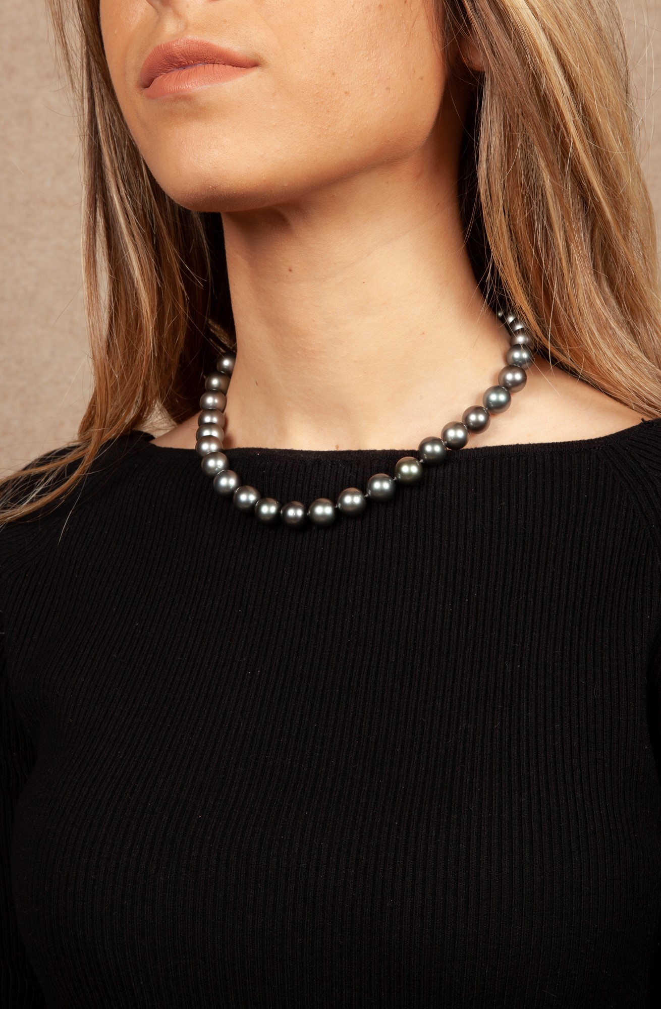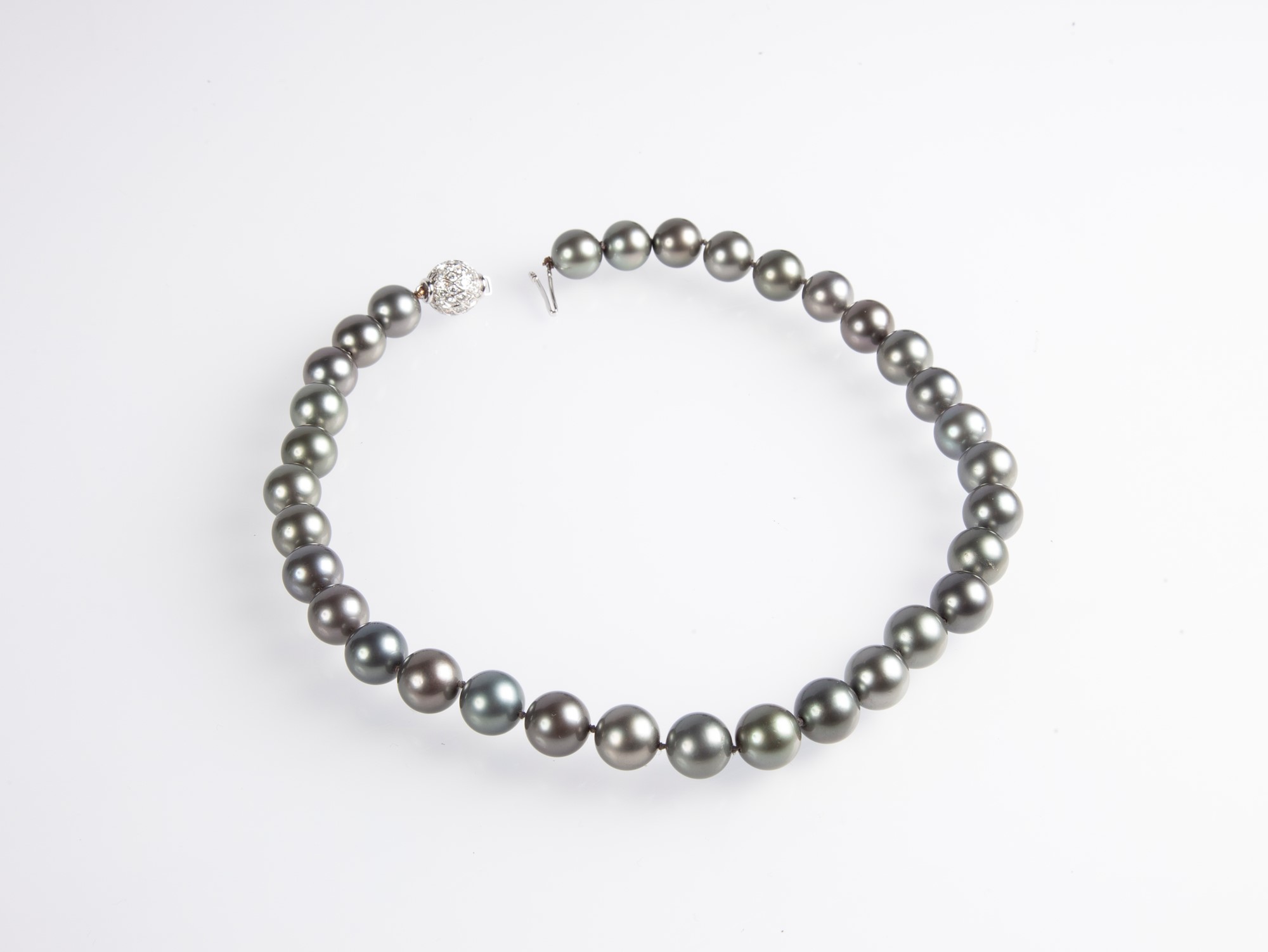 Chiusura oro bianco 750/000. Diamanti taglio rotondo brillante ct. 0,50, Perle mm 11,5. Peso complessivo gr. 79.