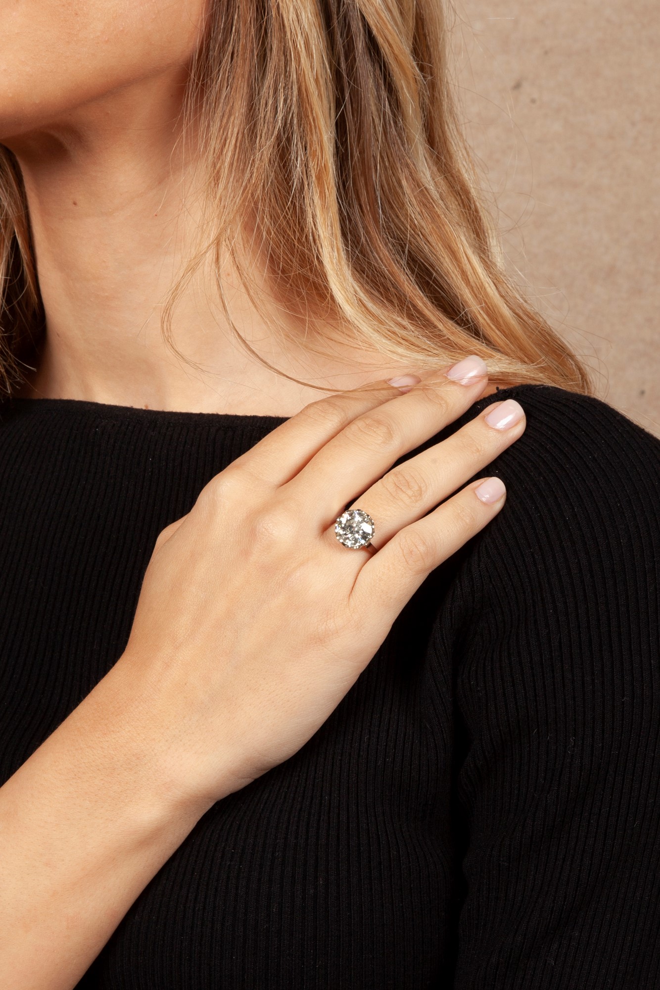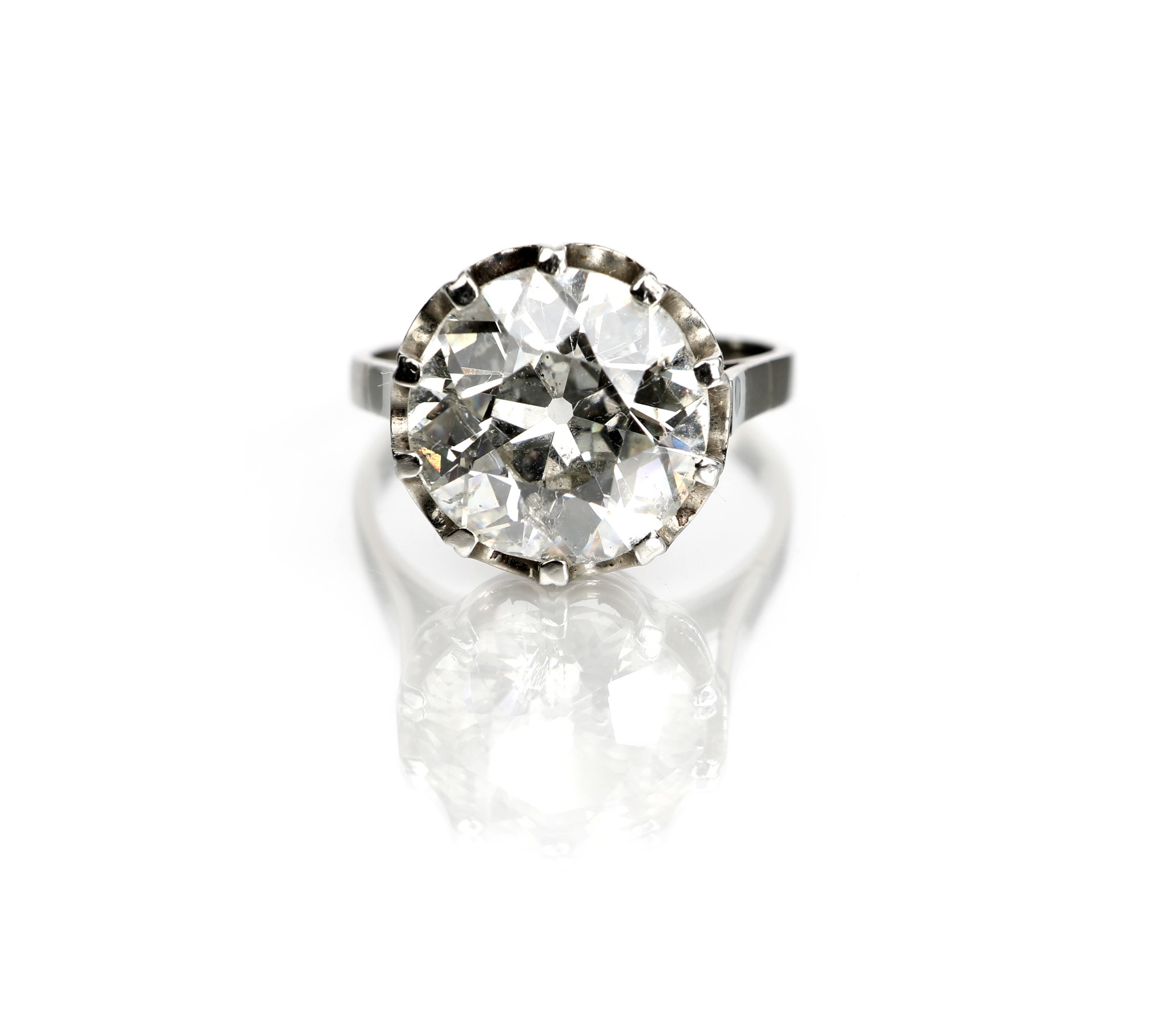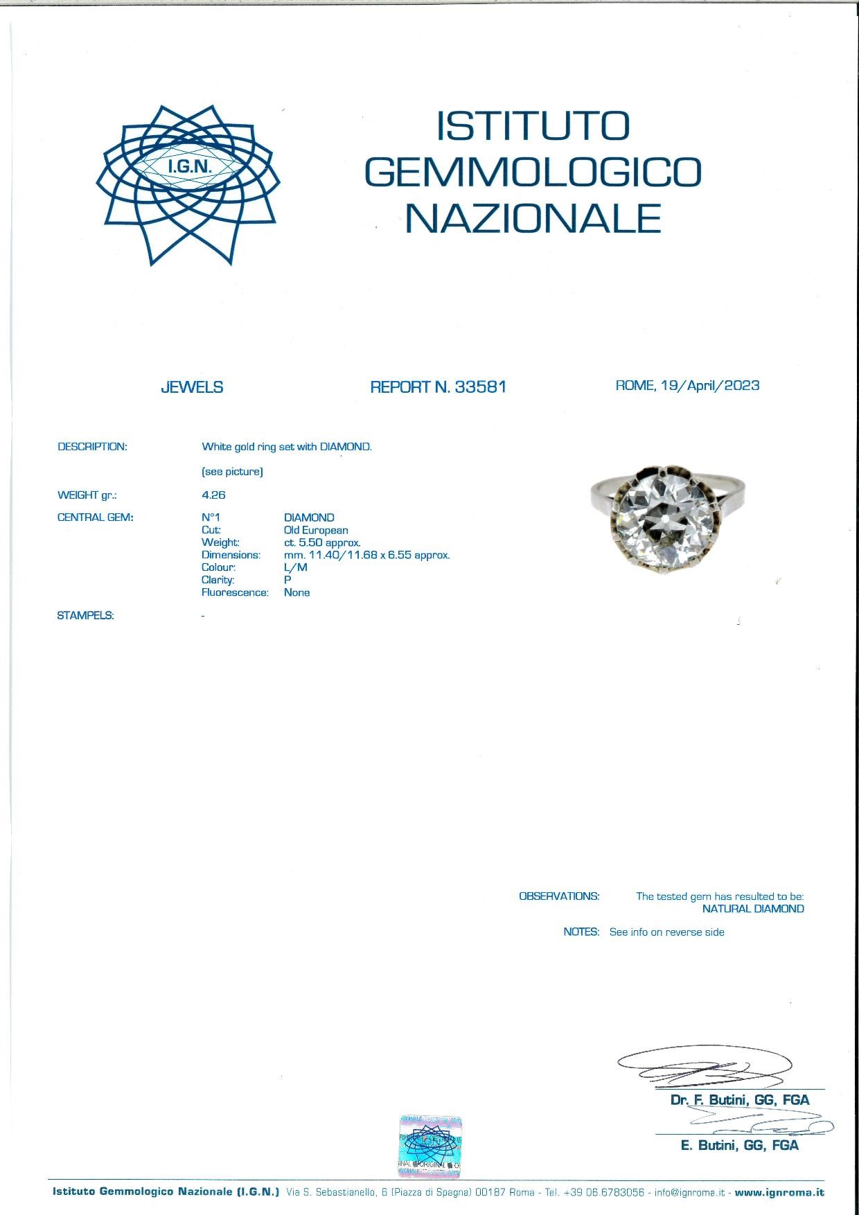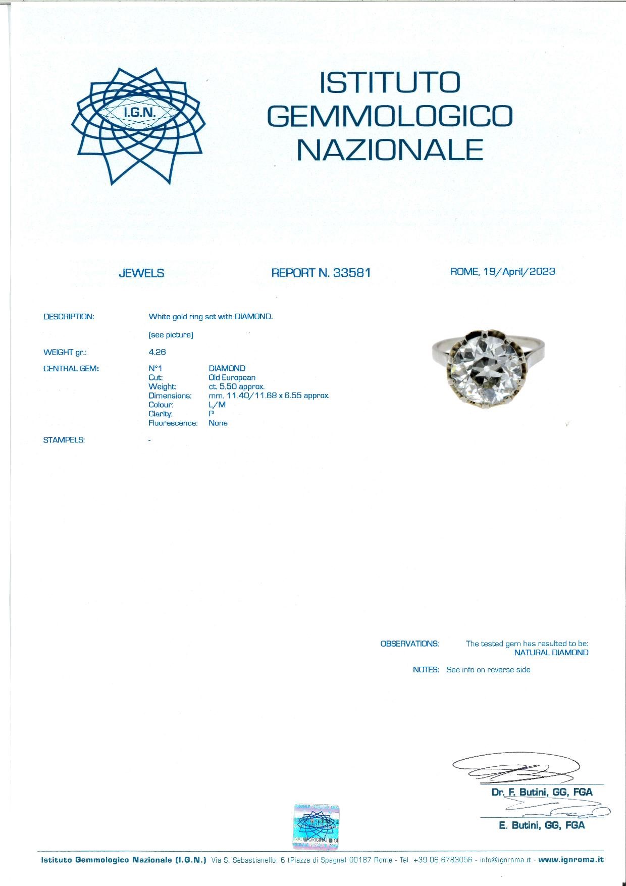 Anello in oro bianco 750/000, diamante in taglio vecchia Europa, ct. 5,50 L/M,P. Peso complessivo gr. 4,20.Corredato di certificazione gemmologica.