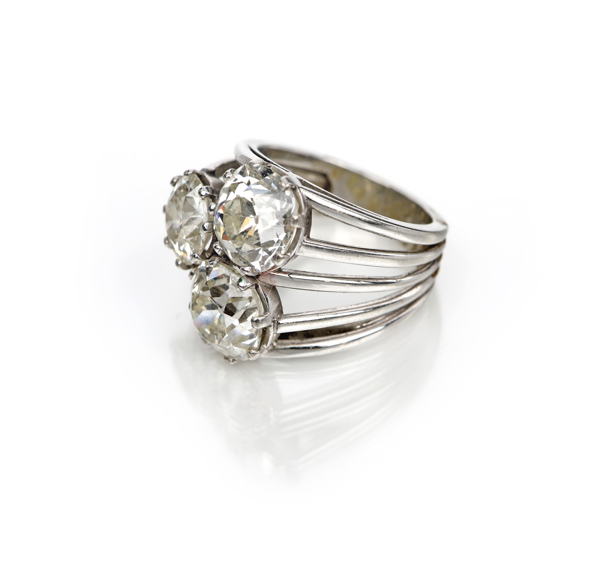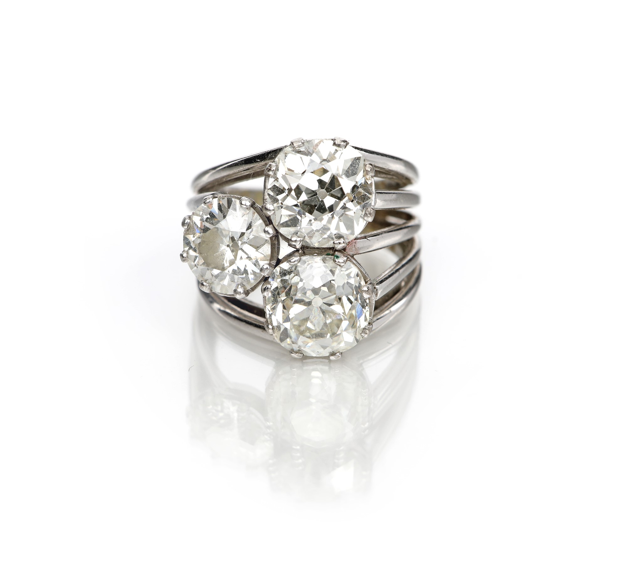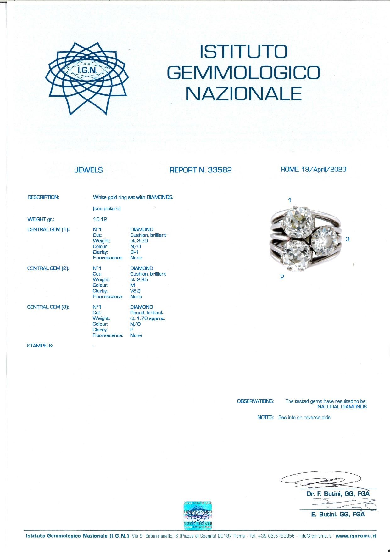 Oro bianco 750/000. Diamante taglio cuscino ct. 3,20 N/O , SI-1, diamante taglio cuscino ct. 2,95 M, diamante taglio rotondo brillante ct. 1,70 N/O, P. Corredato di certificazione gemmologica. Peso complessivo gr. 10,10.