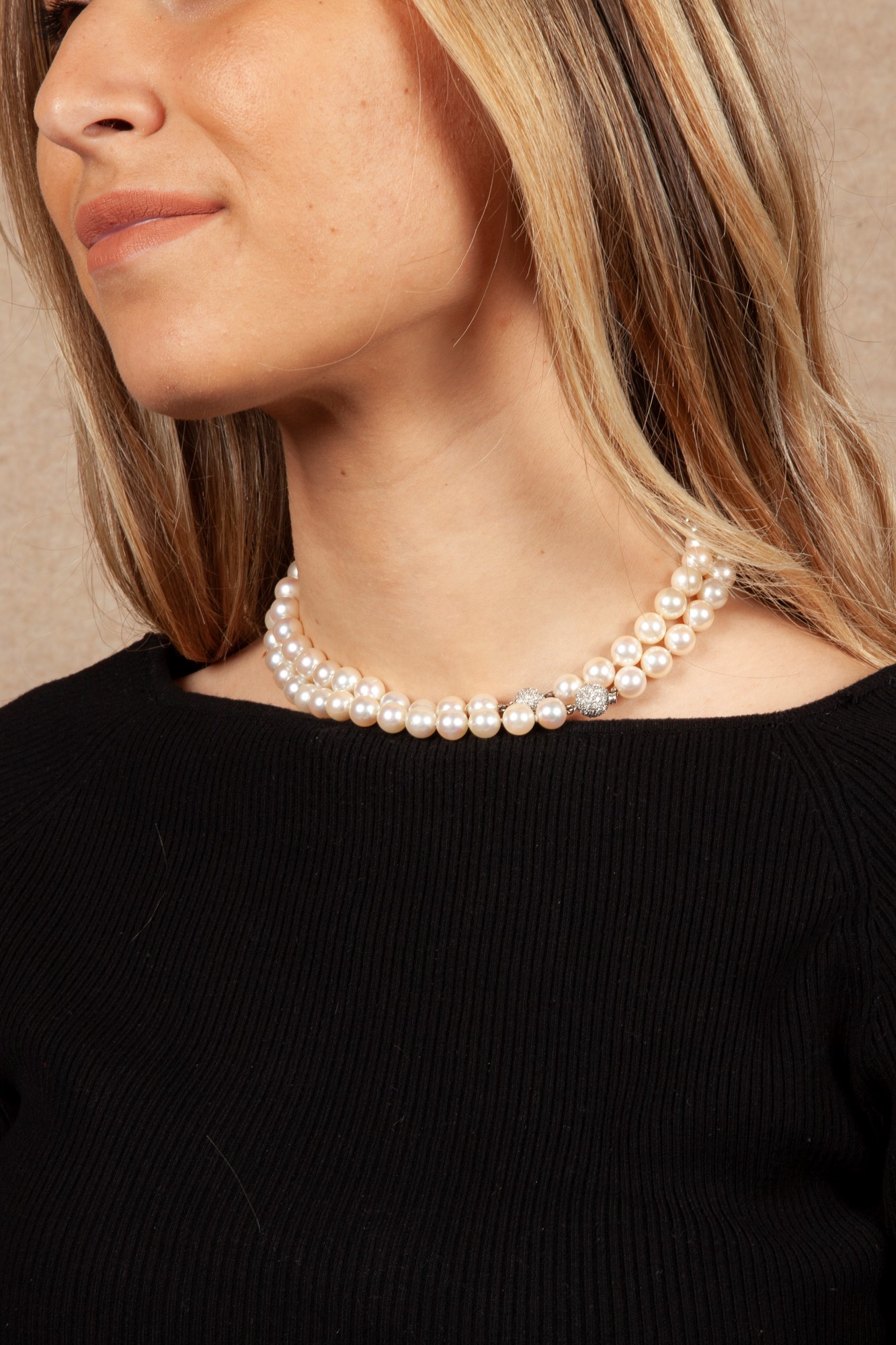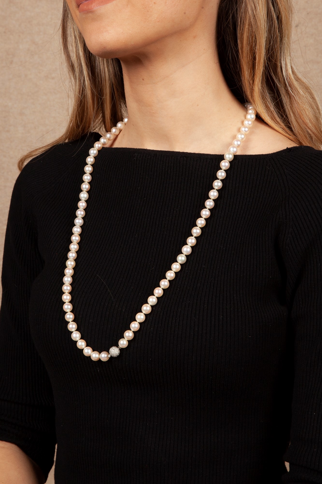Oro bianco 750/000, diamanti taglio rotondo brillante ct. 0,50 ca. Perle da coltivazione in acqua marina, Giappone, doppia chiusura. Peso complessivo gr. 92.