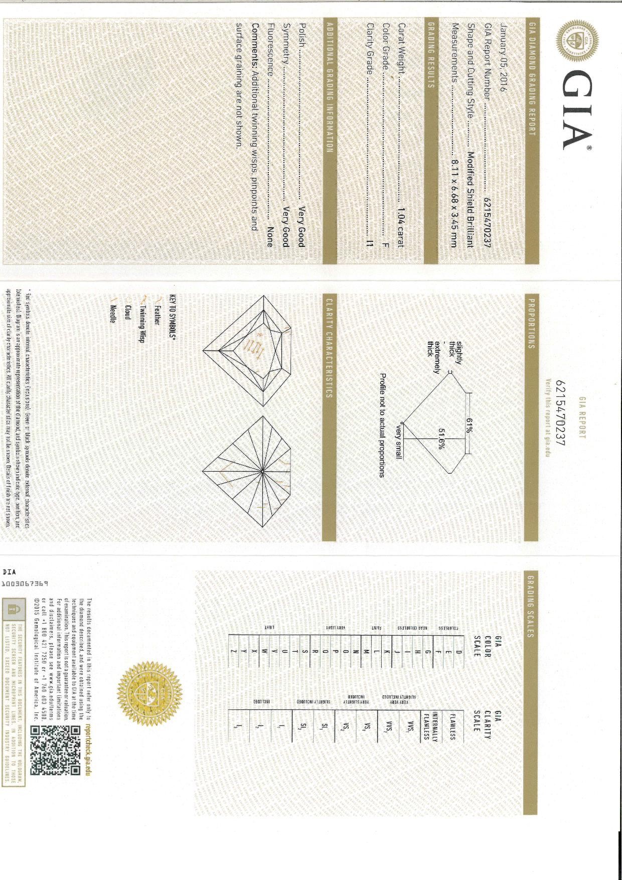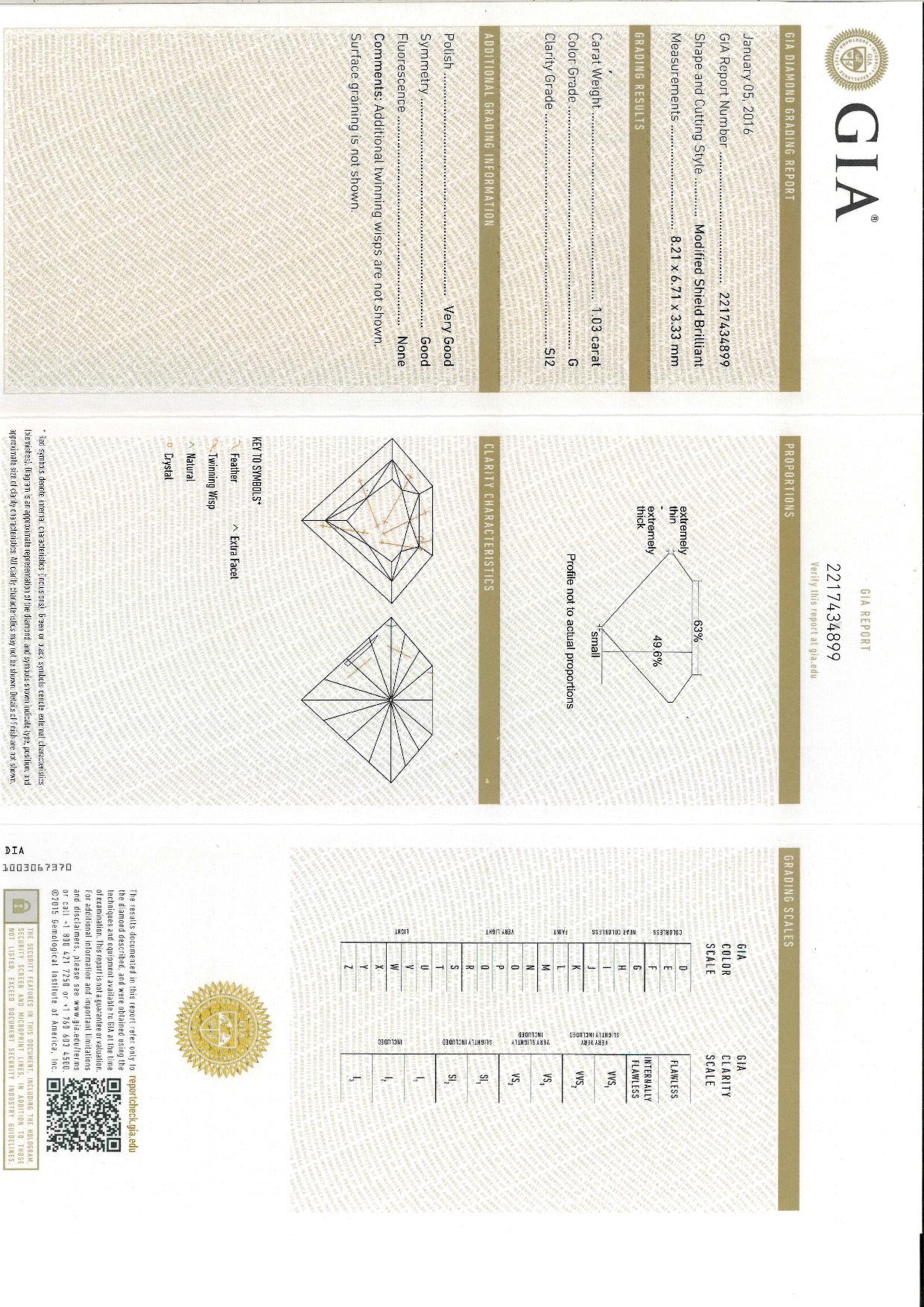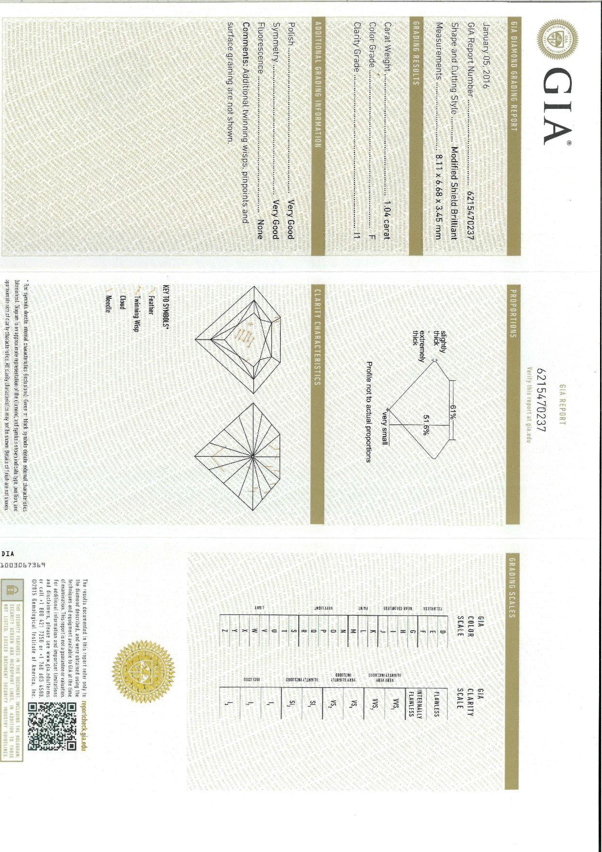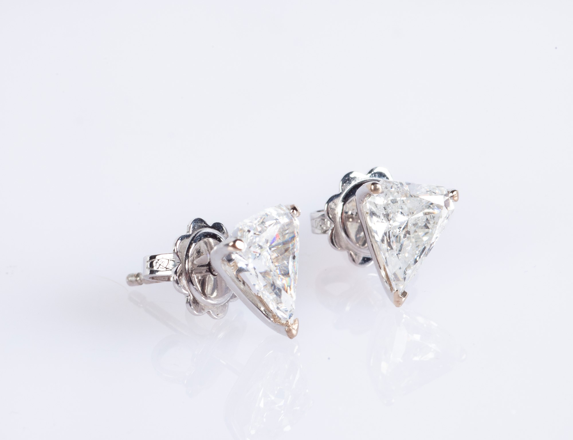 Oro bianco 750/000. Diamanti in taglio scudo ct. 1,04 F I1, ct. 1,03 G SI2. GIA report n° 6215470237, n° 2217434899.