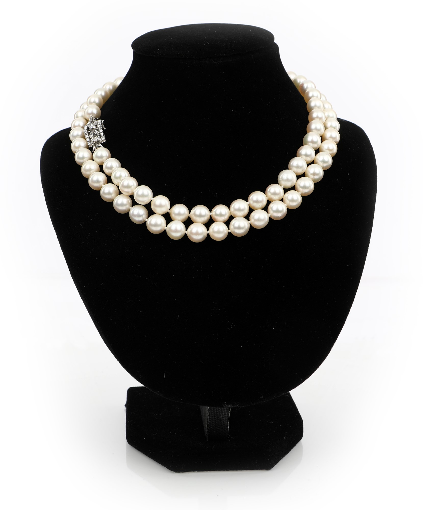 Oro bianco 750/000. Diamanti taglio rotondo brillante, perle naturali giapponesi mm 8,5.