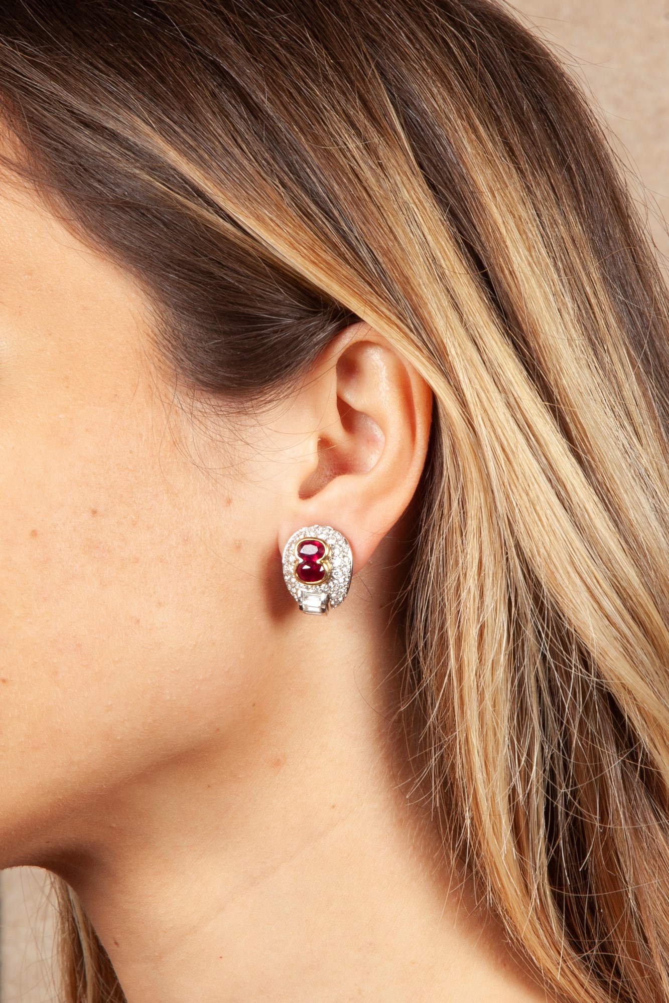Oro bianco e giallo 750/000. Diamanti taglio rotondo brillante e taglio baguettes F-G, IF VVS1 ct. 2,80 ca. Quattro rubini in taglio ovale ct. 3 ca. Peso complessivo gr. 11,20.