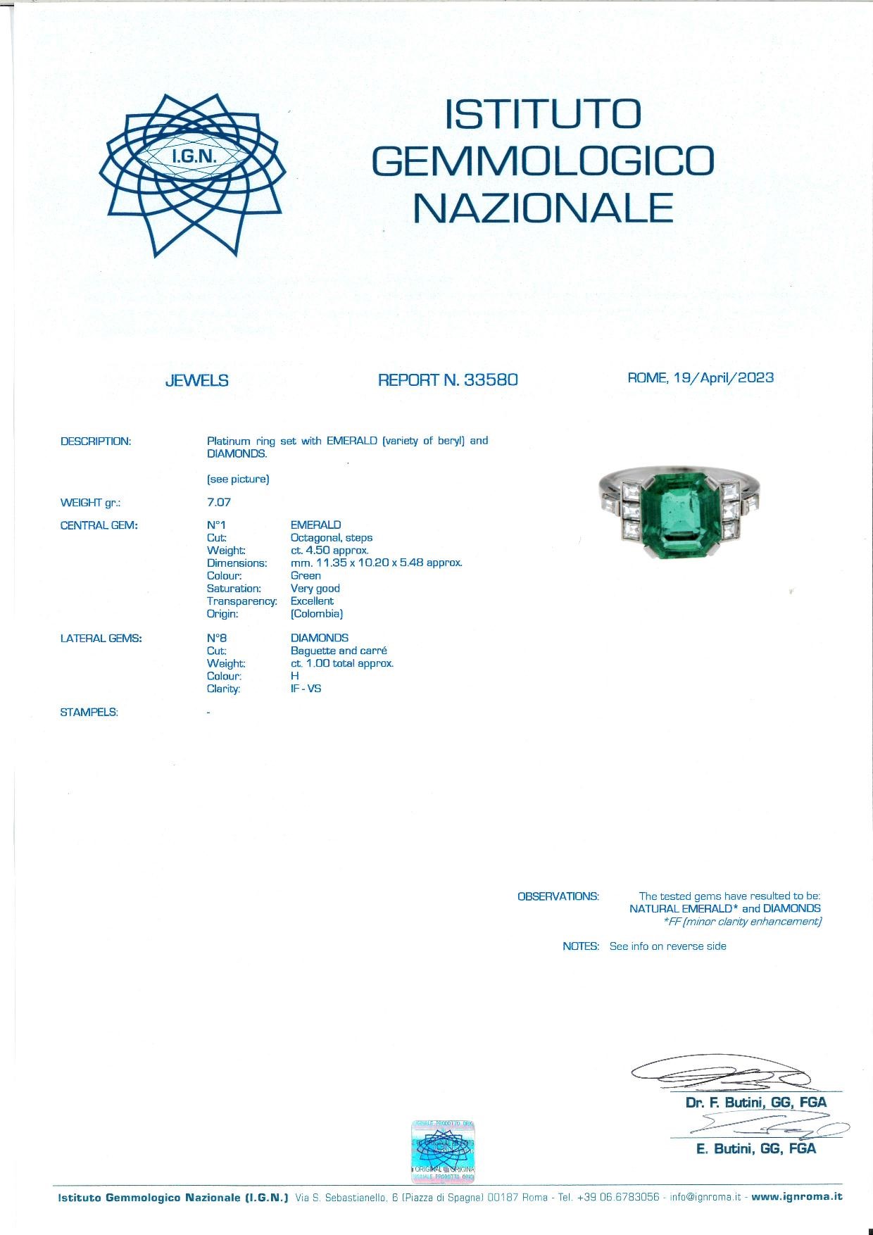 Oro bianco 750/000, smeraldo in taglio smeraldo, Colombia, ct, 4,50. Diamanti in taglio carrè e baguettes ct. 1 H, IF-VS. Peso complessivo gr. 7.