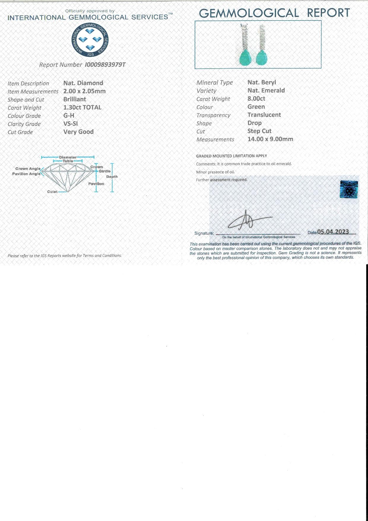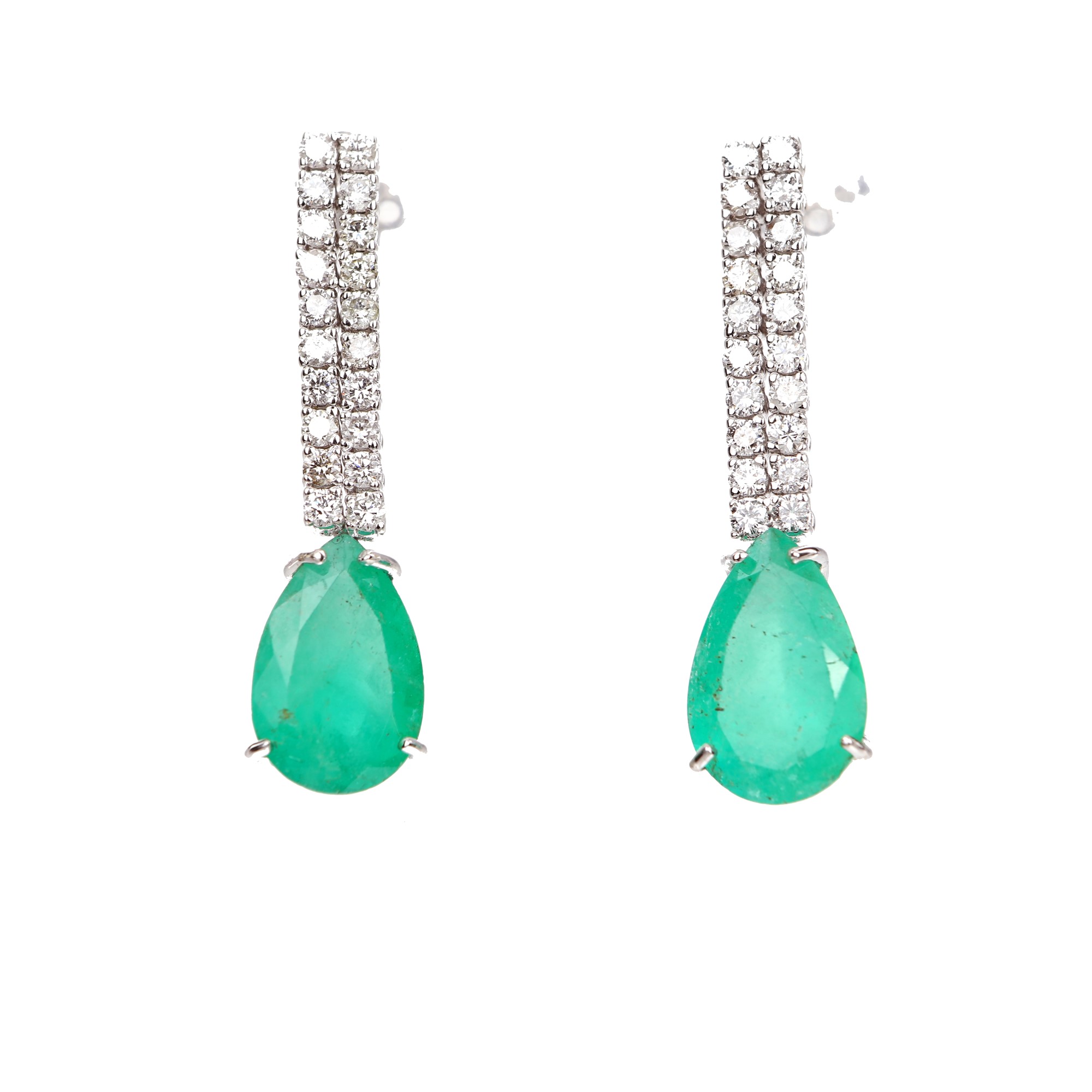 Oro bianco 750/000. Diamanti in taglio rotondo brillante ct. 1,30 G-H VS-SI, smeraldi in taglio goccia ct. 8. Peso complessivo gr. 7,80. Corredati di certificazione gemmologica.