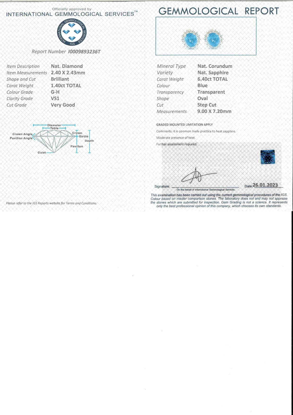 Oro bianco 750/000, diamanti in taglio rotondo brillante ct. 1,40 G-H VS1, zaffiri ct. 6,40. Peso complessivo gr 5,30. Corredati di certificazione gemmologica.