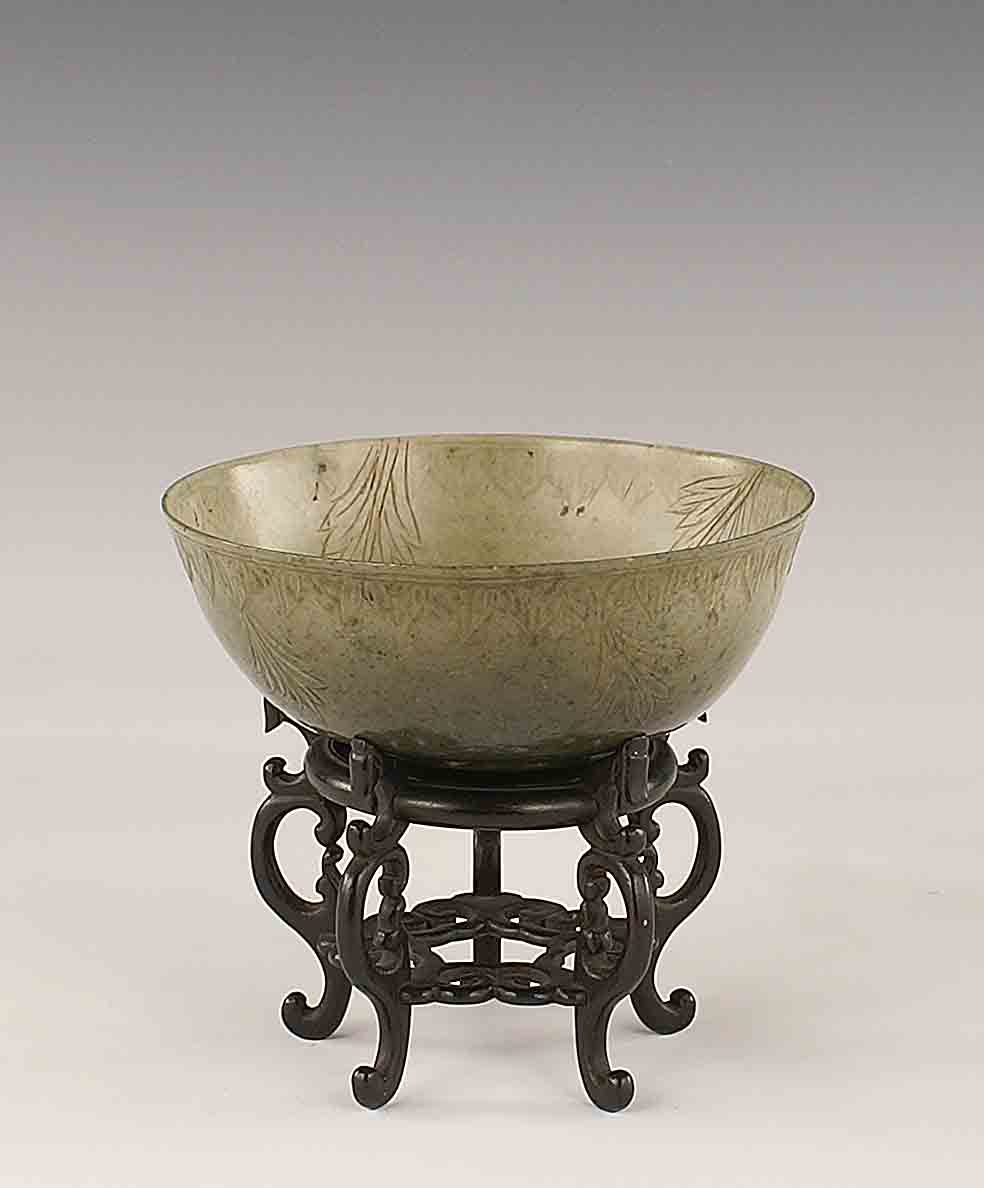 Coppetta in giada poggiante su base in legno di teak, Cina, vecchia...