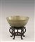 Coppetta in giada poggiante su base in legno di teak, Cina, vecchia manifattura, h. cm. 12,5.