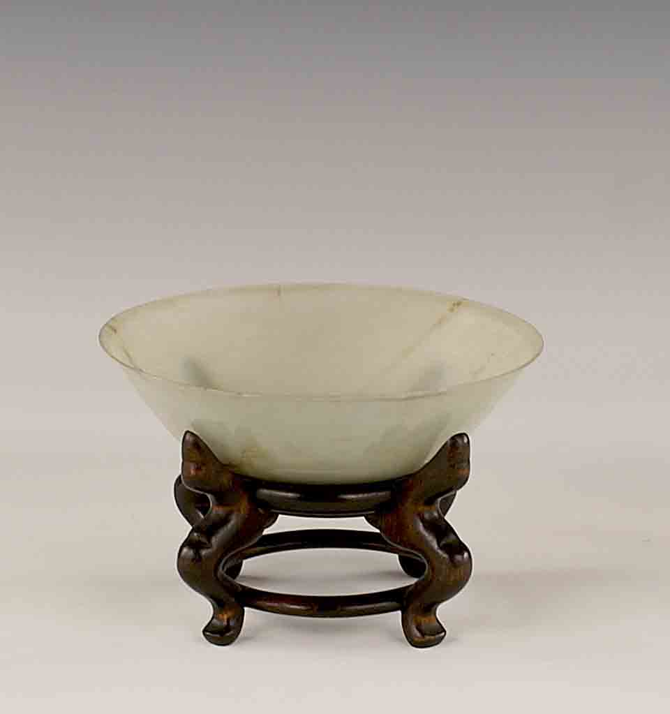 Coppetta in giada poggiante su base in legno di teak, Cina, vecchia...