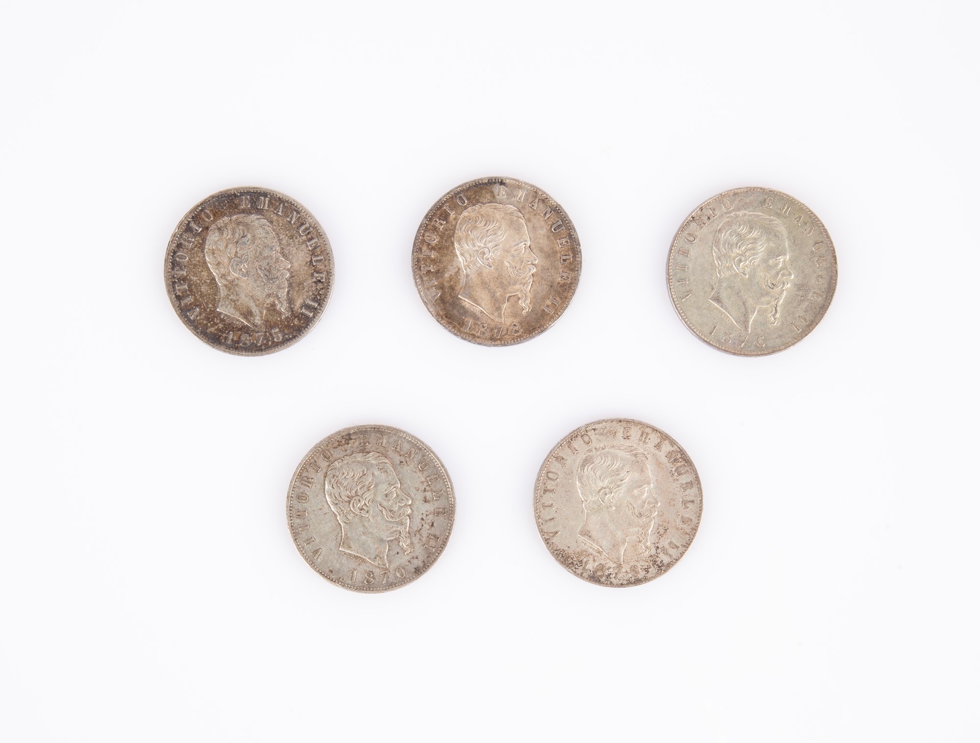 5 monete da 5 Lire Vittorio Emanuele II Regno d'Italia 1870 Roma; 1875...