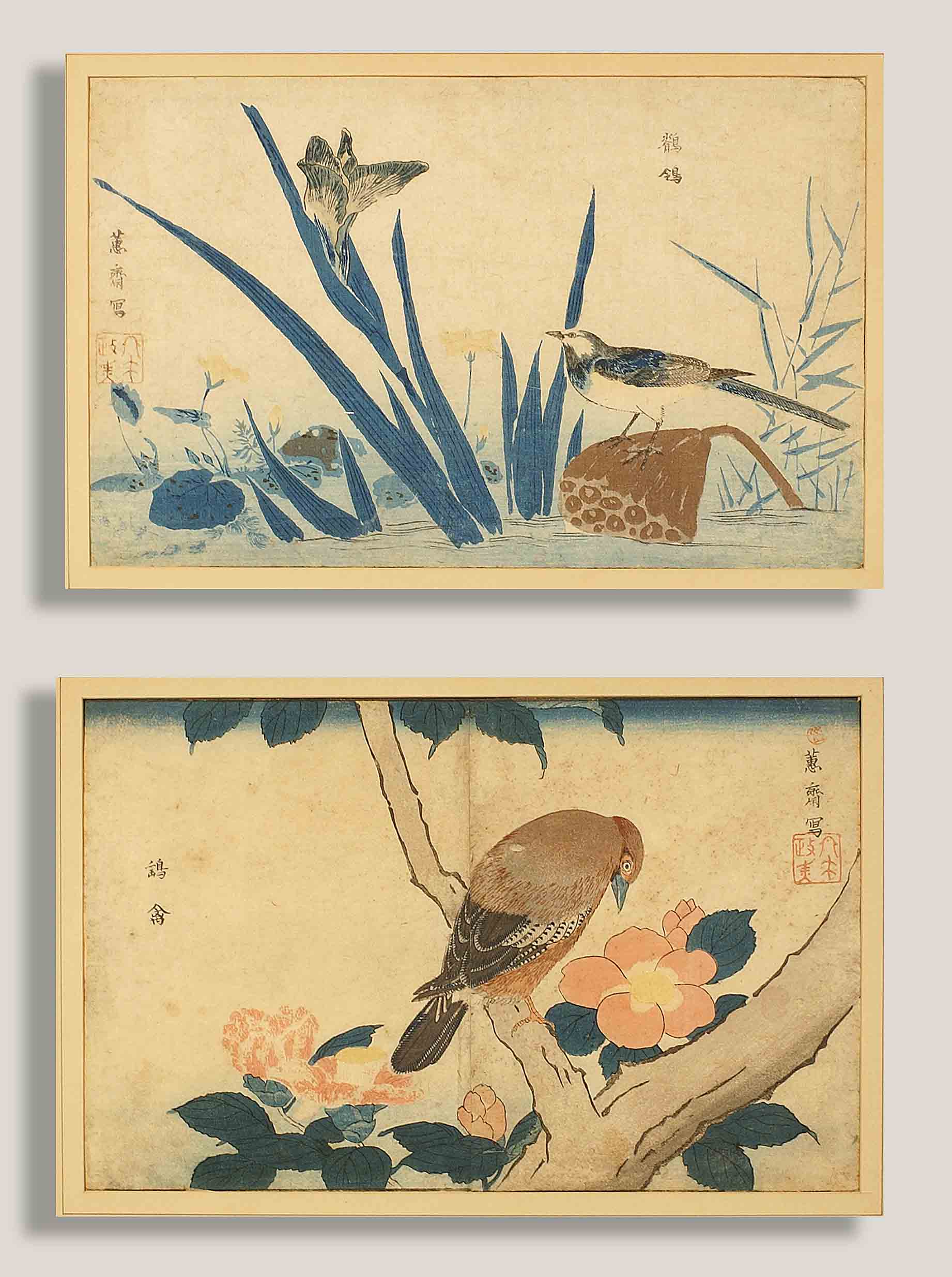 Scuola giapponese del XIX secolo, "Volatili", coppia di litografie a colori,...