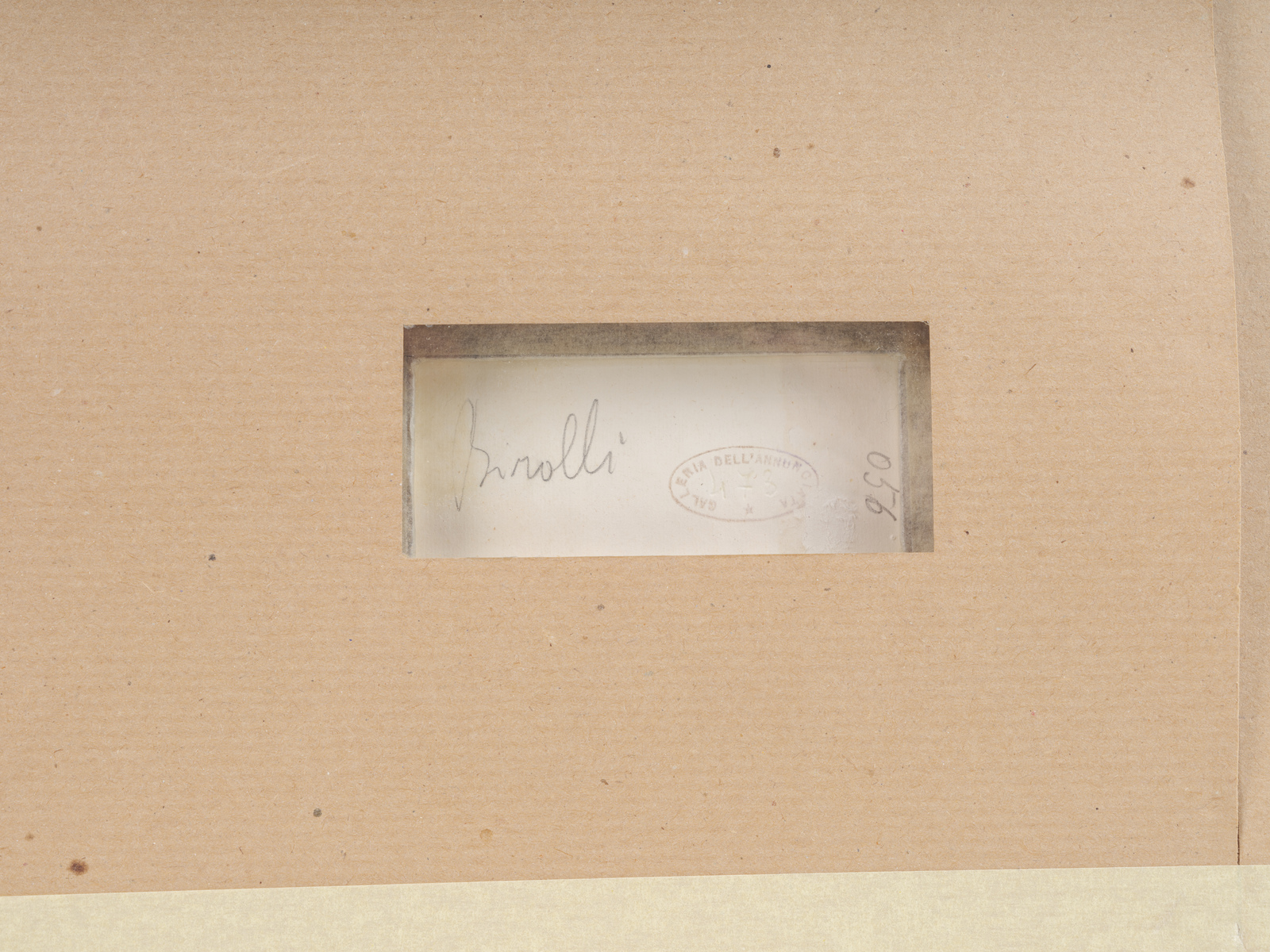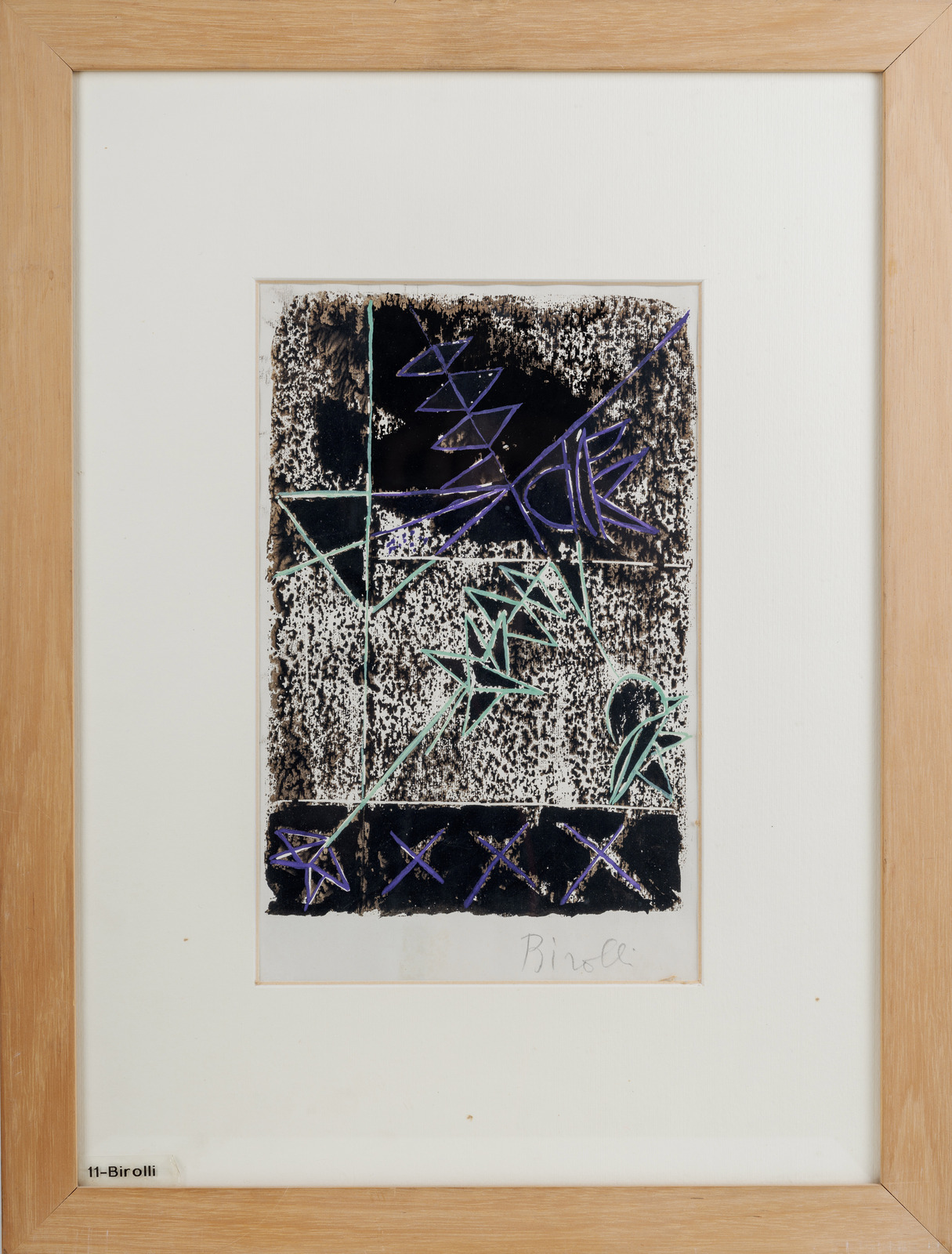 BIROLLI RENATO (1905 - 1959) Senza titolo. Tecnica mista su carta. Cm 24,00 x 33,00. Firma e anno in basso a matita. Al retro firma e timbro Galleria dell'Annunciata, Milano. Provenienza: Galleria Annunciata, Milano; Collezione Besner - Decca. Lievi difetti. Cornice presente