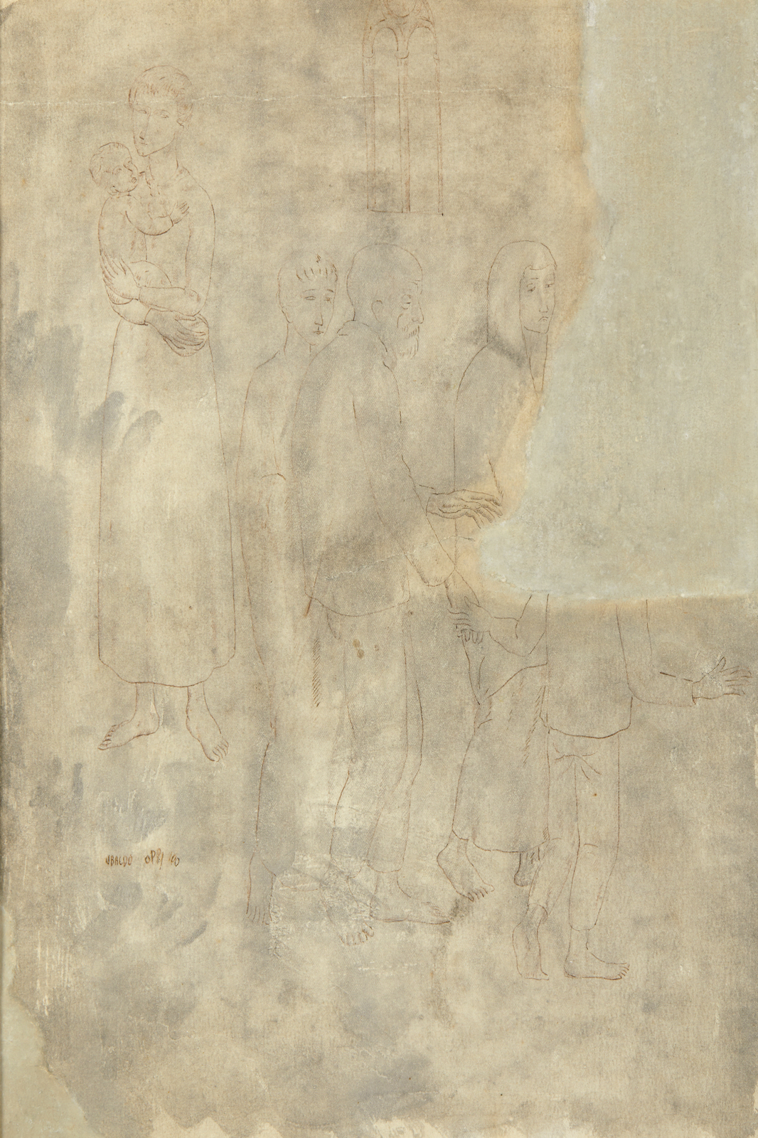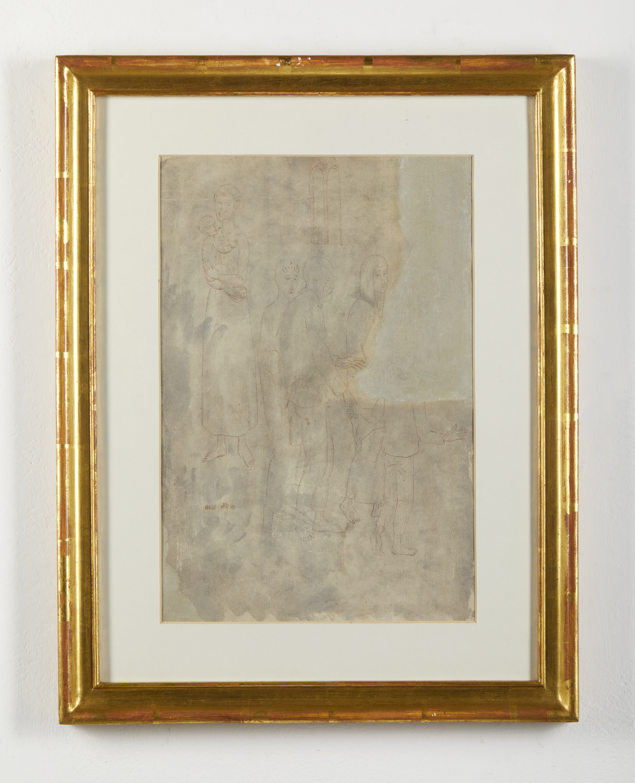 OPPI UBALDO (1889 - 1942) La famiglia. . 1918. Tecnica mista su carta. Cm 29,50 x 43,80. Firma e anno a sinistra. Al retro cartigli Galleria dello Scudo, Verona e Collezione Paola Gian Ferrari-Braghiroli. Difetti. . Cornice presente
