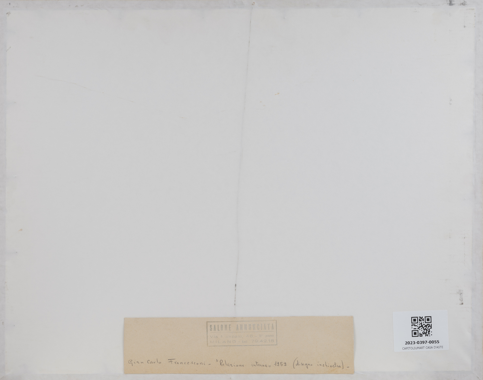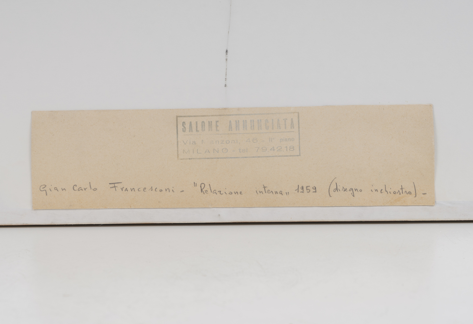 FRANCESCONI GIANCARLO (n. 1930) Relazione interna. 1959. Inchiostro su carta. Cm 27,00 x 19,50. Firma e anno in basso a destra. Al retro cartiglio descrittivo Salone Annunicata, Milano. Provenienza: Salone Annunciata, Milano; Collezione Besner - Decca. Lievi difetti.
