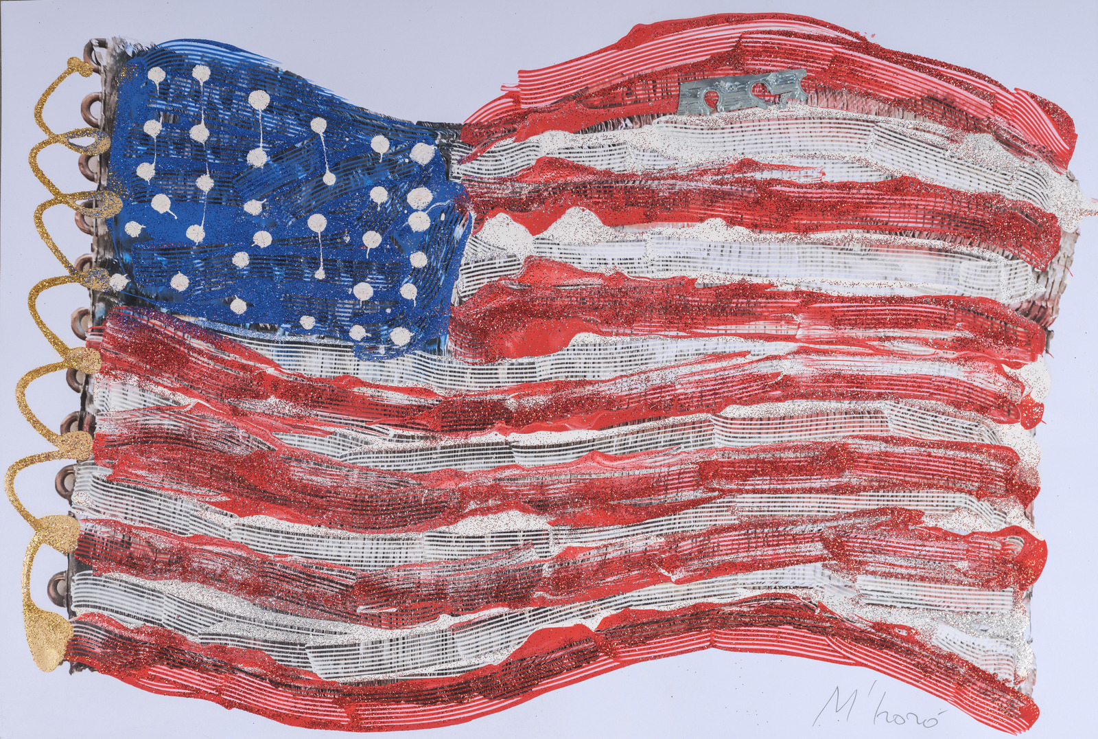 M'HORO' Senza titolo. Tecnica mista e collage su cartoncino. Cm 48,80 x 33,00. E1. Tiratura al retro. Firma in basso a destra a matita. Al retro timbro Minotauro Fine Art Gallery,Palazzolo, Autentica dell'artista su fotografia.