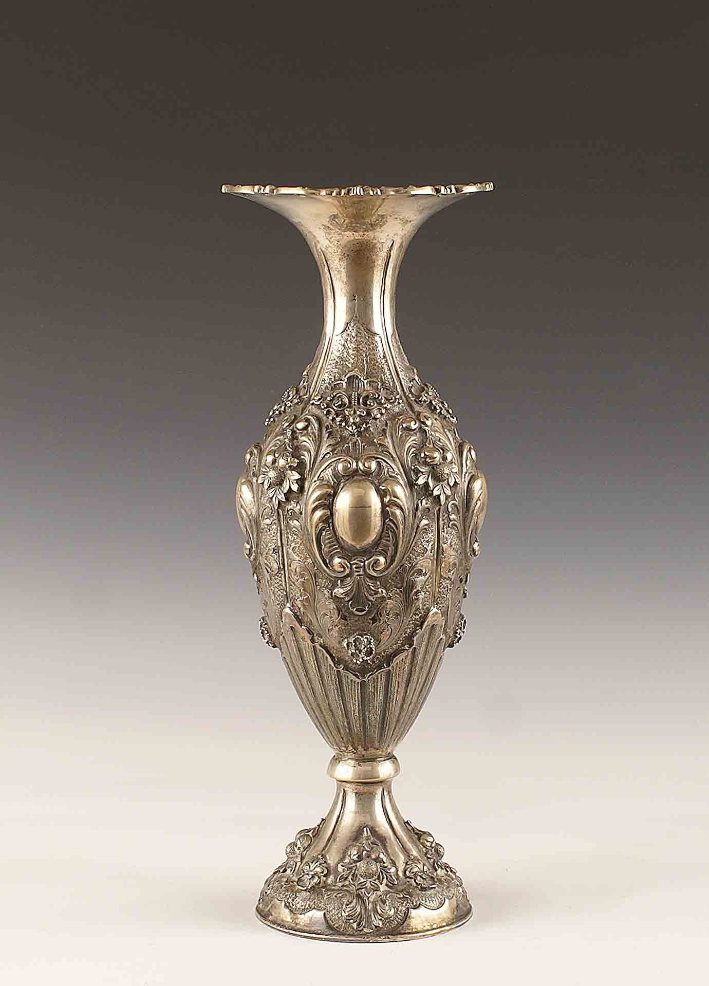 Vaso in argento a balaustro, sbalzato ed inciso a motivo di frutta e fiori, vecchia manifattura italiana, gr. 1195, h. cm. 42,4.