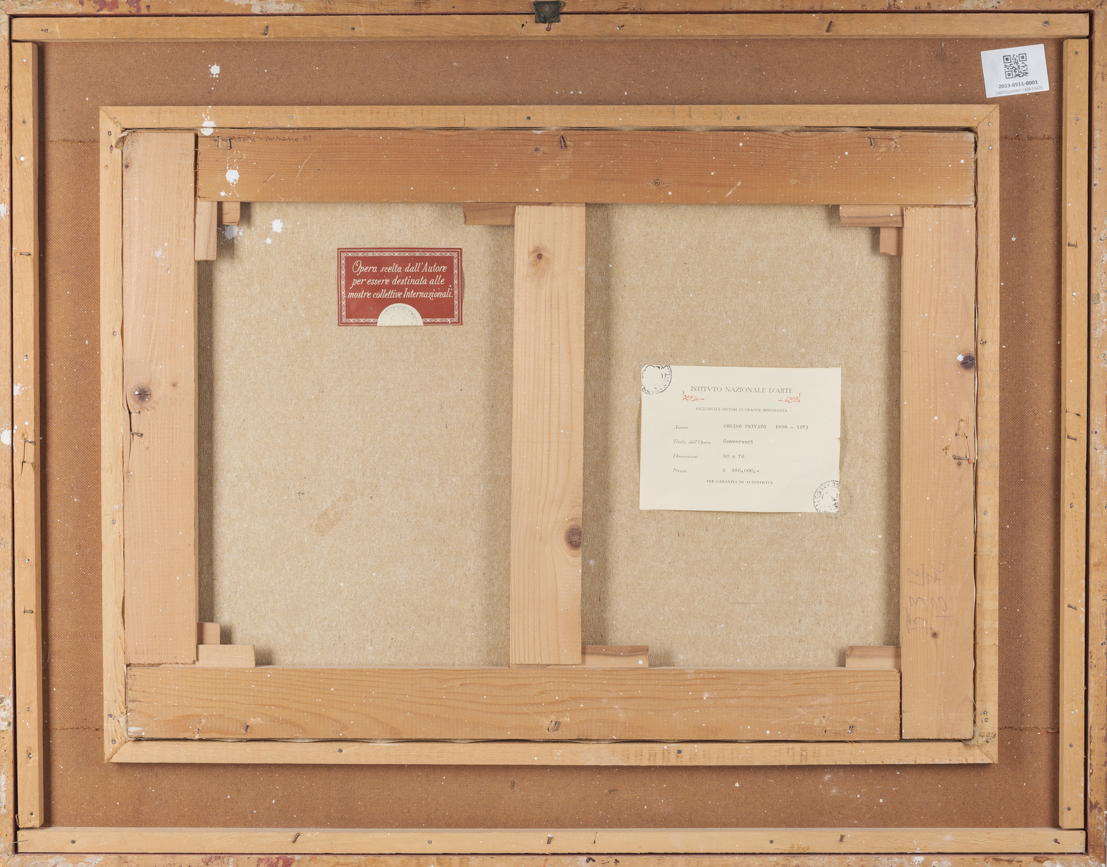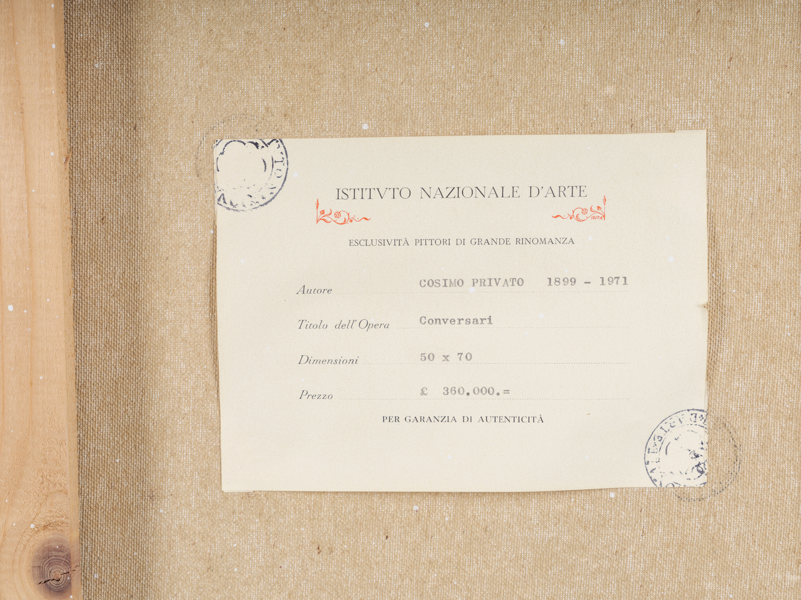 PRIVATO COSIMO (1899 - 1971) Conversari. 1957. Olio su tela . Cm 70,00 x 50,00. Firma in basso a destra. Al retro titolo, anno e cartiglio Istituto Nazionale d'Arte. Cornice presente