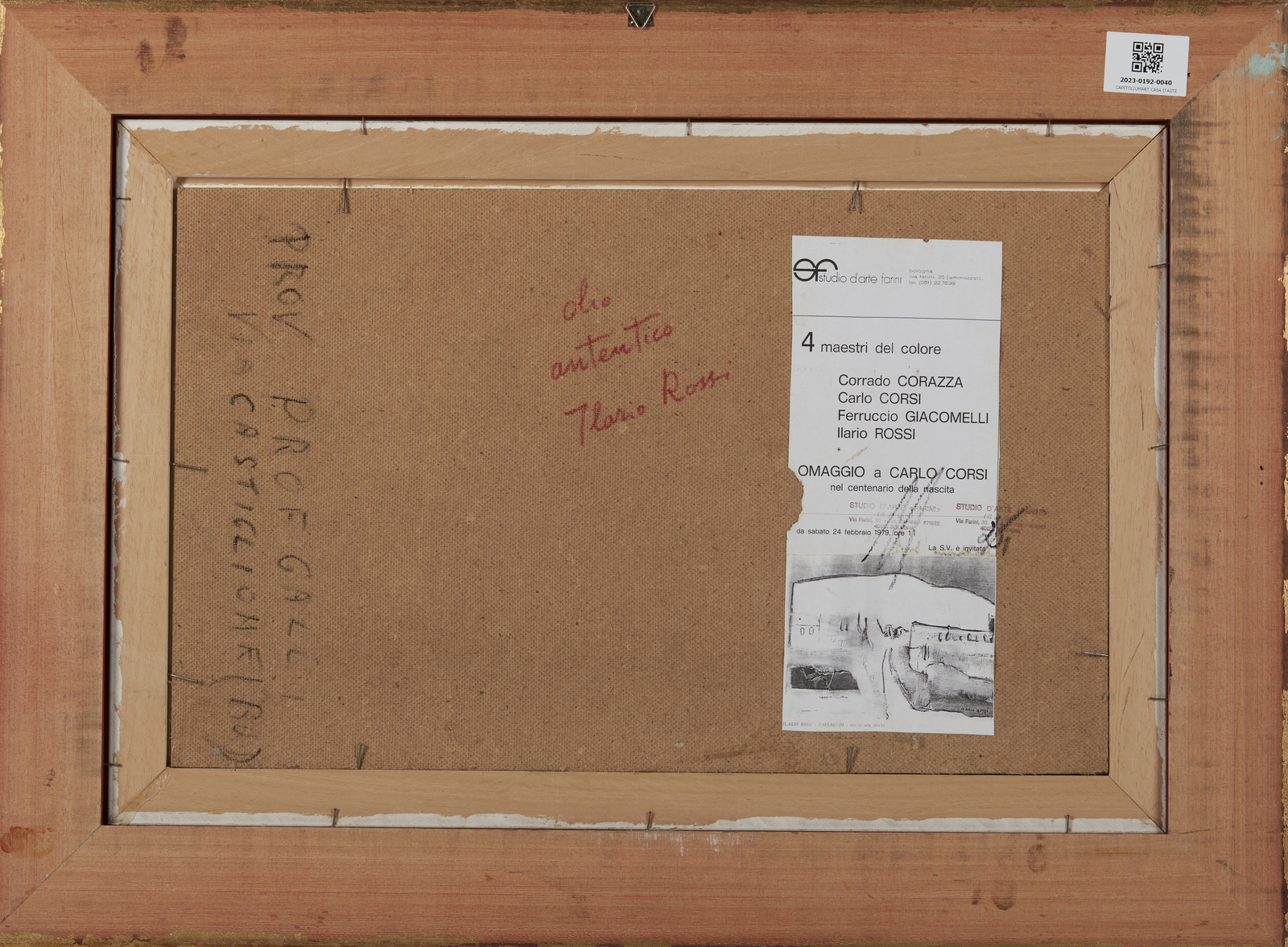 ROSSI ILARIO (1911 - 1994) Senza titolo. Olio su compensato. Cm 60,00 x 37,50. Firma in basso a destra e al retro. Esposizioni: "4 maestri del colore. Corrado Corazza, Carlo Corsi, Ferruccio Giacomelli, Ilario Rossi" Studio d'arte Farini, Bologna (24 febbraio 1979). Provenienza: Studio d'arte Farini, Bologna; Collezione Galli, Bologna; Collezione privata, Bologna. Cornice presente