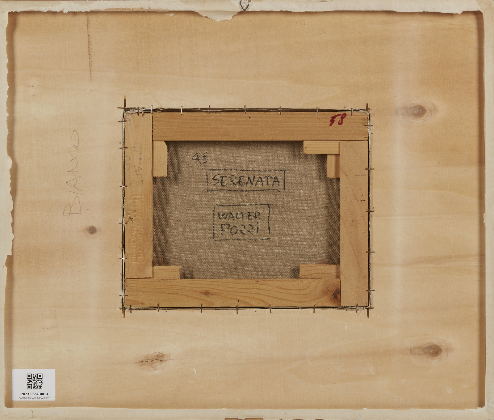 POZZI WALTER (1911 - 1989) Serenata. Olio su tela . Cm 30,00 x 24,00. Firma in basso a destra. Al retro titolo e firma. Lievi difetti. Cornice presente