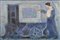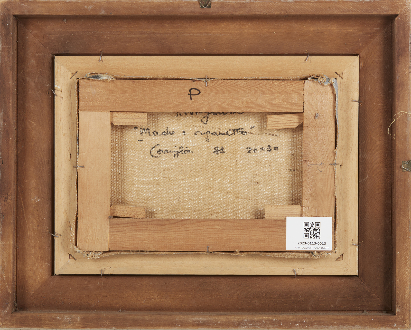 LONGARETTI TRENTO (n. 1916) Madre e organetto. Olio su tela . Cm 30,00 x 20,00. Firma in basso a sinistra. Al retro firma e titolo. Opera in corso di archiviazione presso l'Archivio Trento Longaretti. . Cornice presente