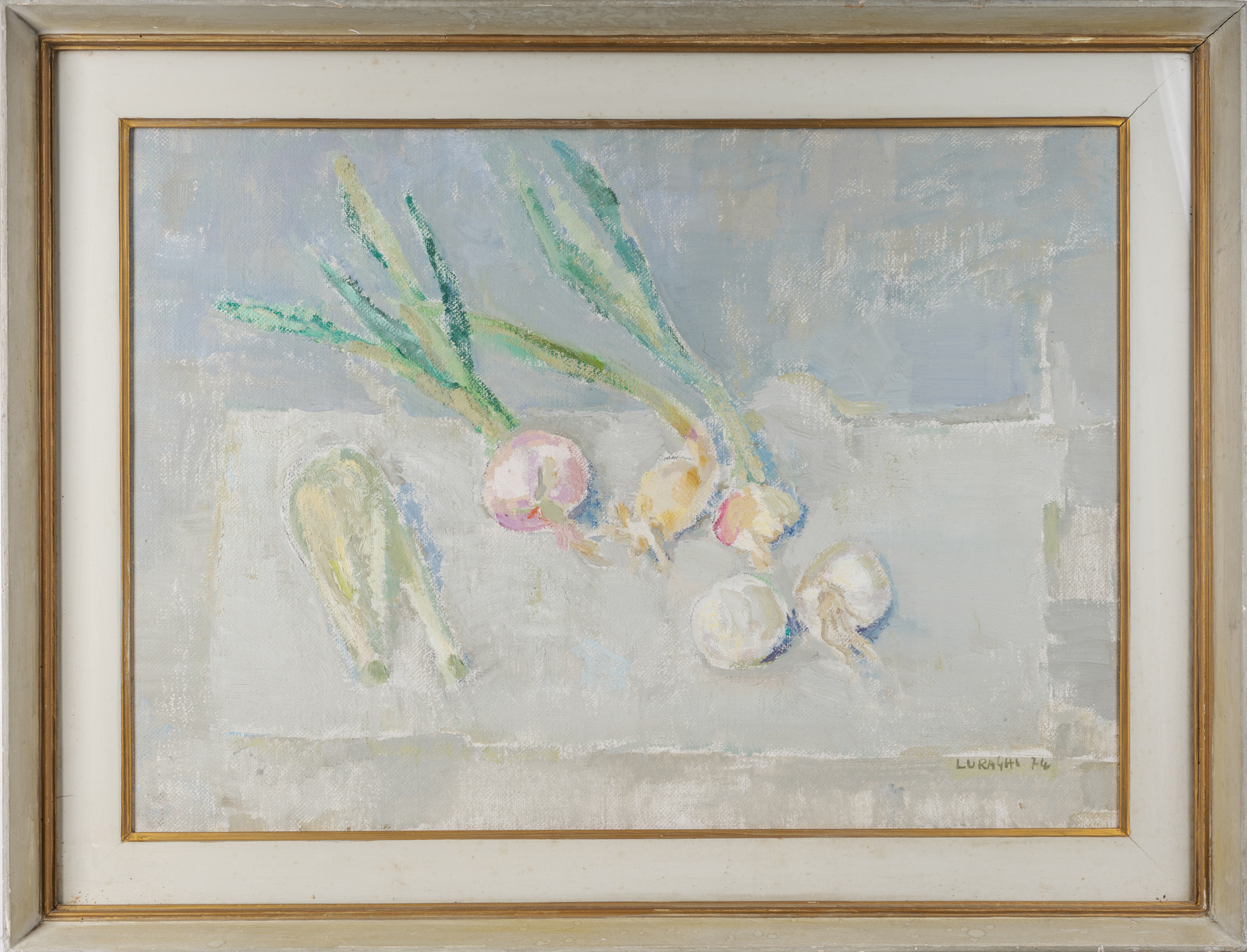 LURAGHI CHIARA (n. 1931) Natura morta. 1974. Olio su tela . Cm 70,00 x 50,00. Firma e anno in basso a destra. Esposizioni: Chiara Luraghi. Gli immediati dintorni, Galleria Ponte Rosso, Milano, 27 ottobre-11 novembre 1990. Lievi difetti. Cornice presente