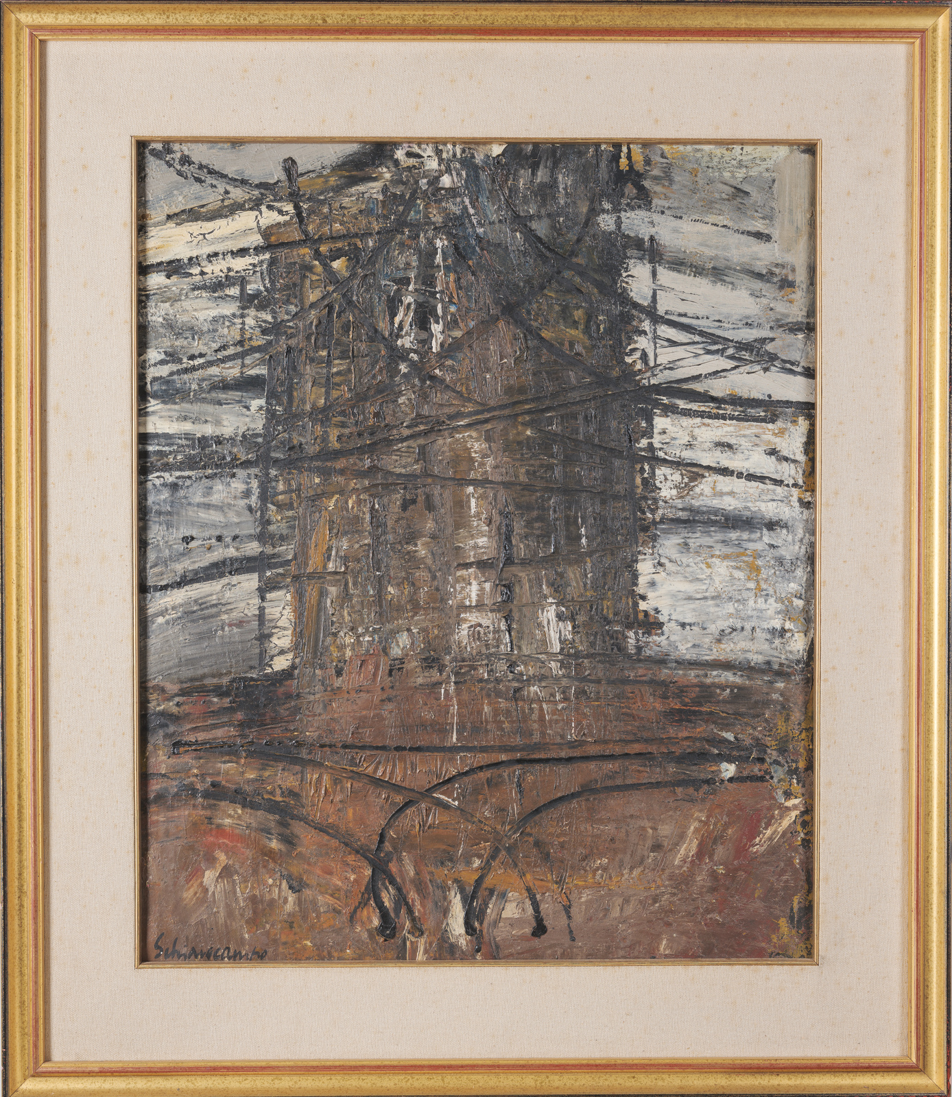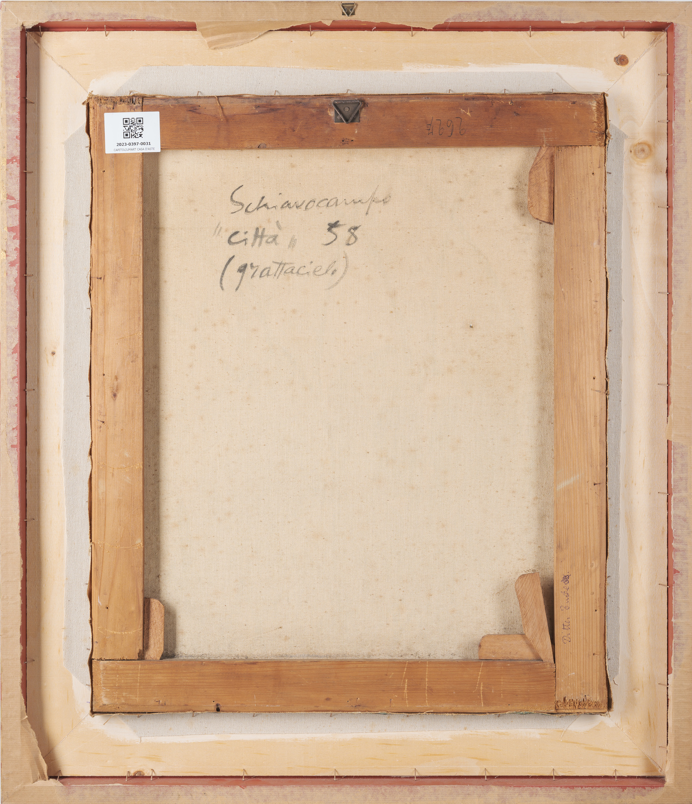 SCHIAVOCAMPO PAOLO (n. 1924) Città (grattacieli). 1958. Olio su tela . Cm 50,00 x 59,00. Firma in basso a sinistra. Al retro firma, titolo e anno. Provenienza: Collezione Besner - Decca. Lievi difetti. Cornice presente