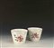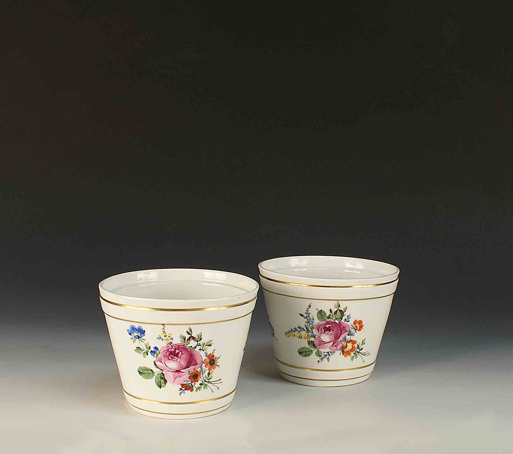 Coppia di piccoli cachepots in porcellana dipinta a policromia a motivo floreale, Meissen, vecchia manifattura, h. cm. 10, d. cm. 13 (difetti).