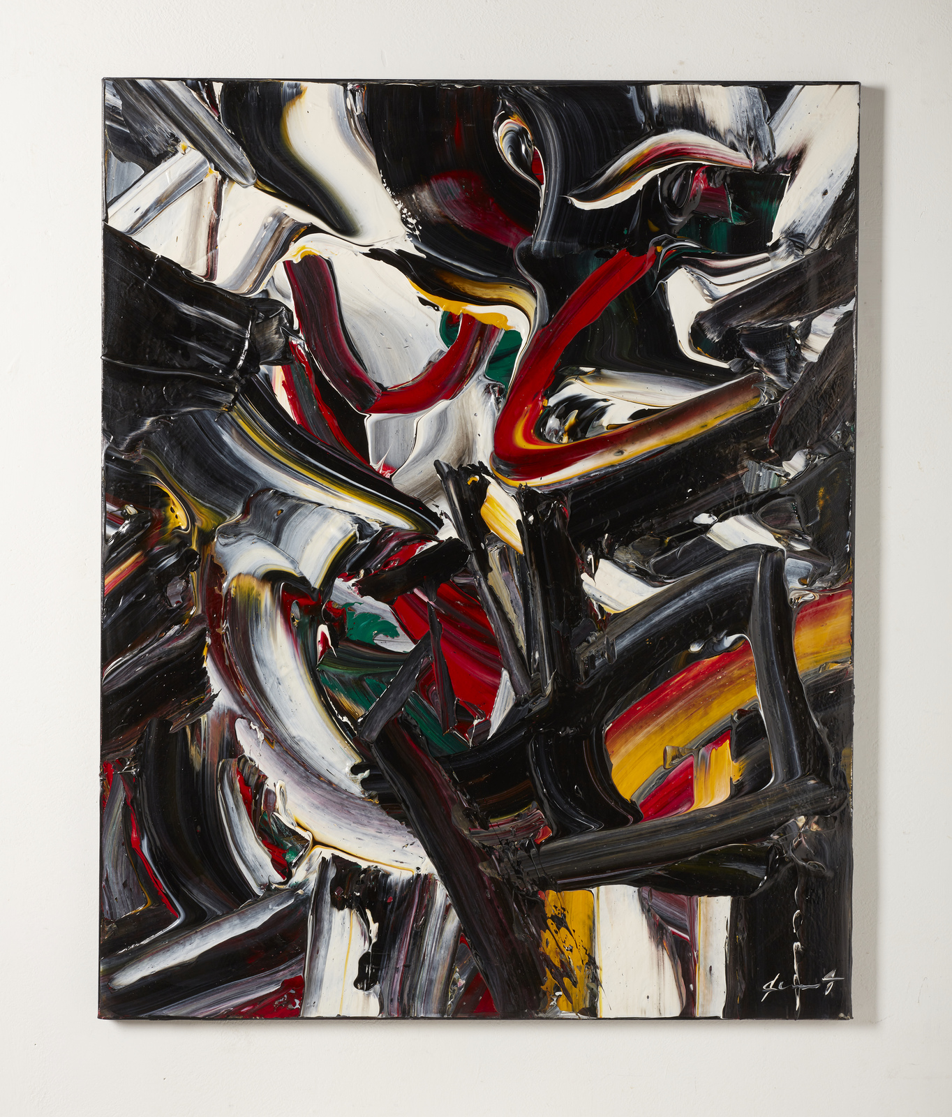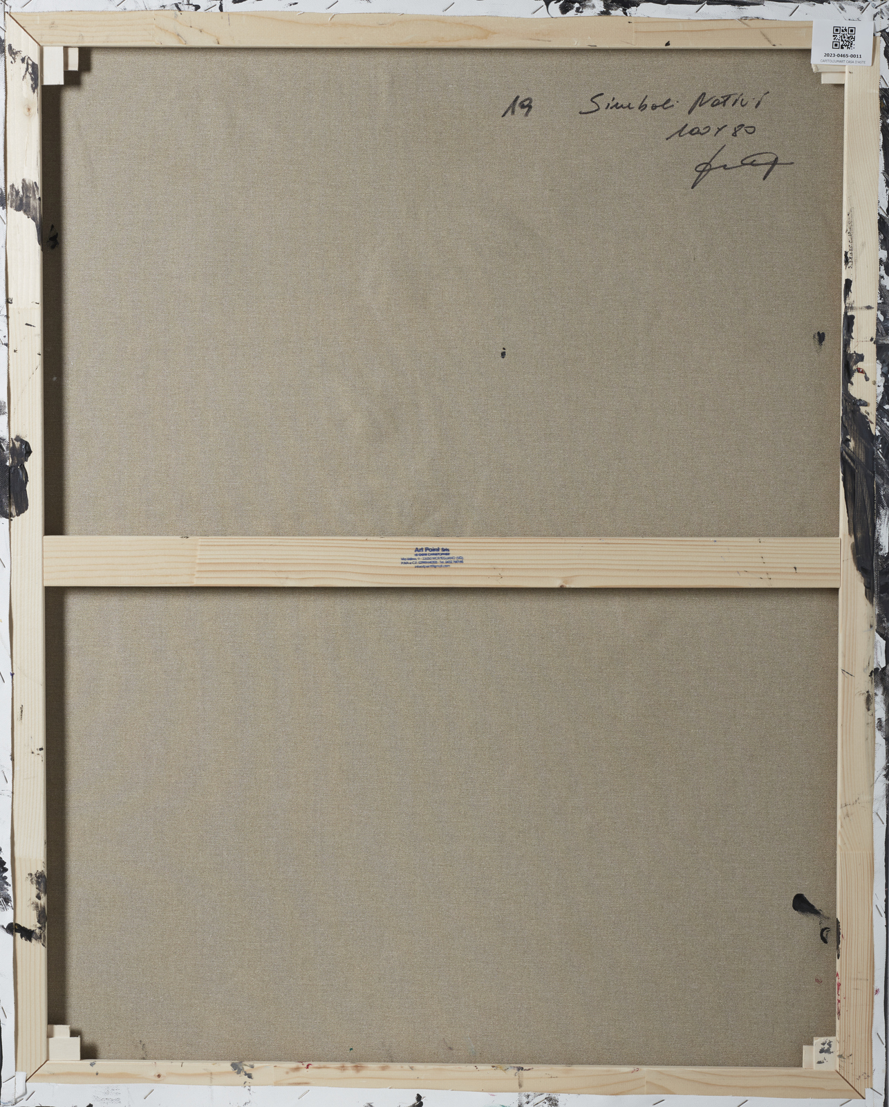 DE LUTTI PIERLUIGI (n. 1959) Simboli nativi. Olio su tela . Cm 80,00 x 100,00. Al retro titolo, firma e anno. Autentica dell'artista su fotografia. Lievi difetti.