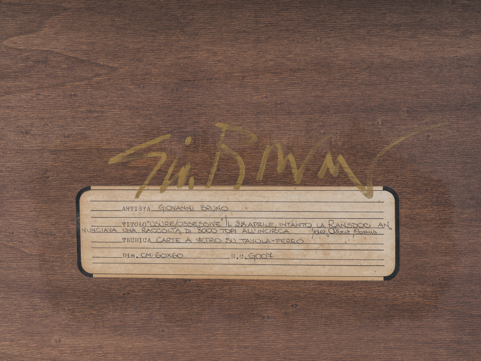 BRUNO GIOVANNI (n. 1961) Usure/Ossessive. Tecnica mista su tavola. Cm 57,00 x 57,00. Al retro firma e cartiglio descrittivo dell'artista. Cornice presente