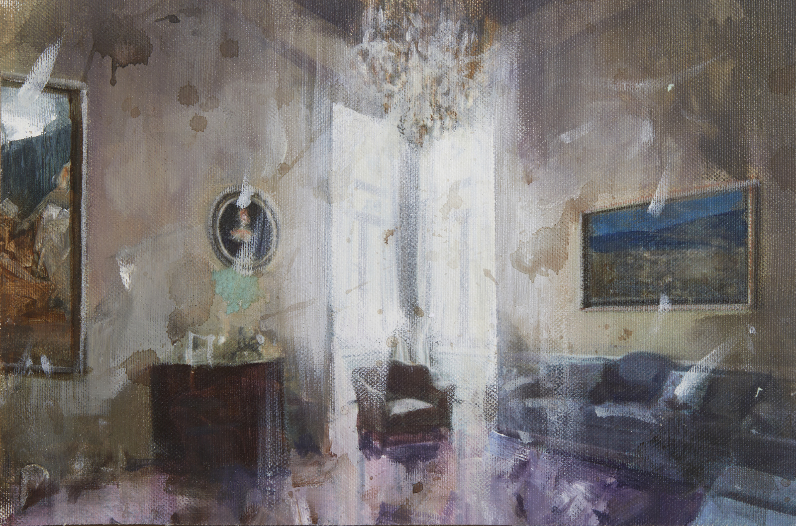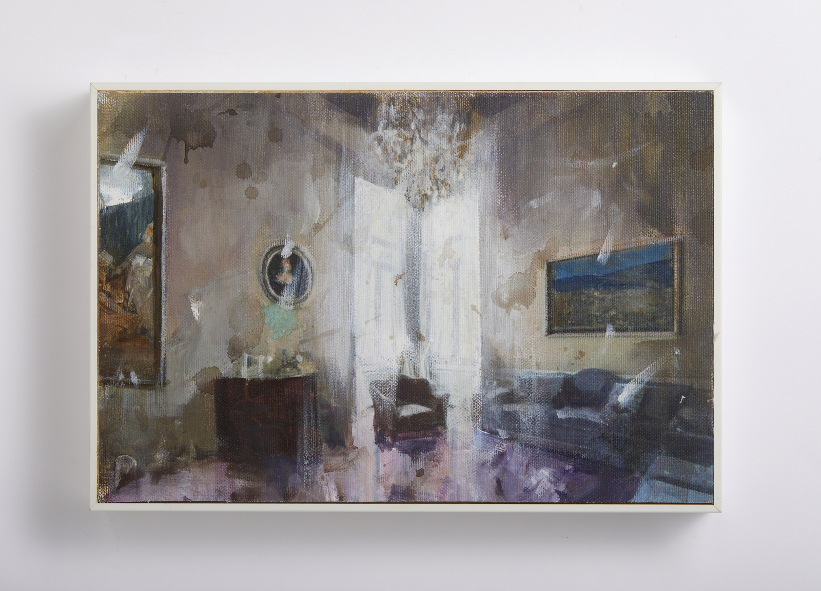 CAVEDON GIAMPIETRO (n. 1951) Interno. tecnica mista su tela applicata su tavola. Cm 30,00 x 20,00. Al retro titolo e firma. Autentica dell'artista su fotografia.