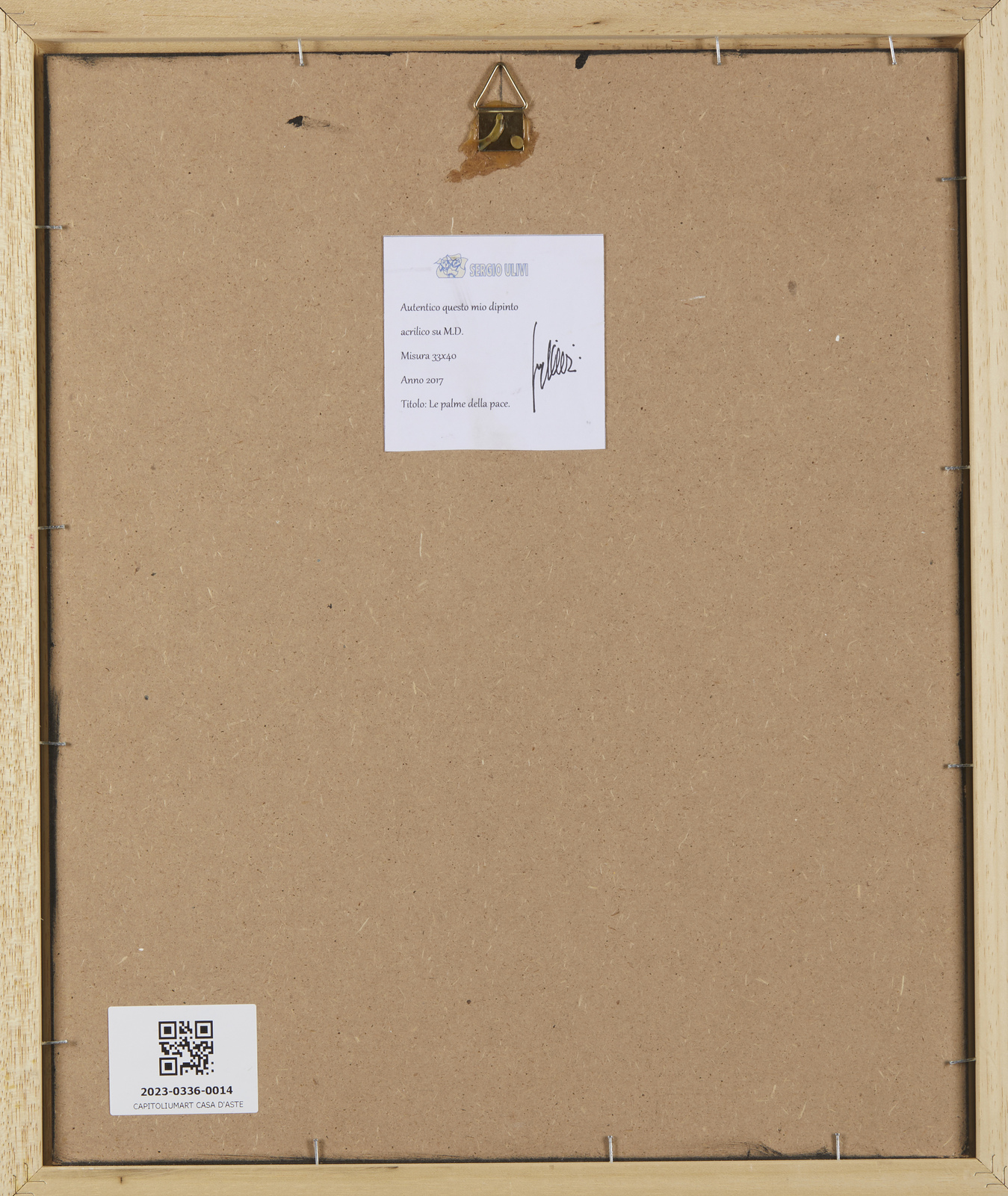 ULIVI SERGIO (n. 1955) Le palme della pace. 2017. Acrilico su tavola. Cm 33,00 x 40,00. Firma in basso a sinistra. Al retro cartiglio descrittivo.