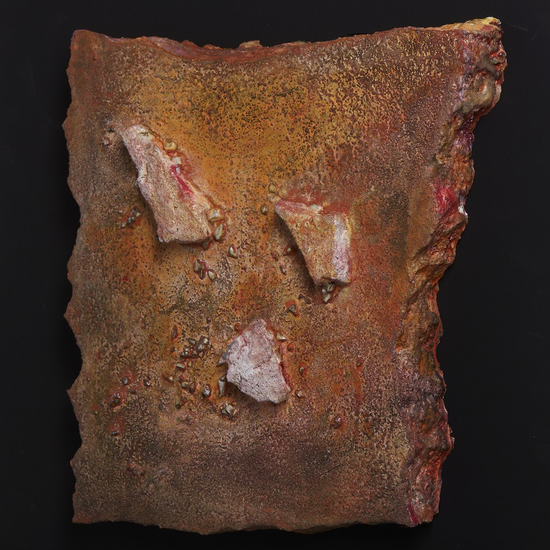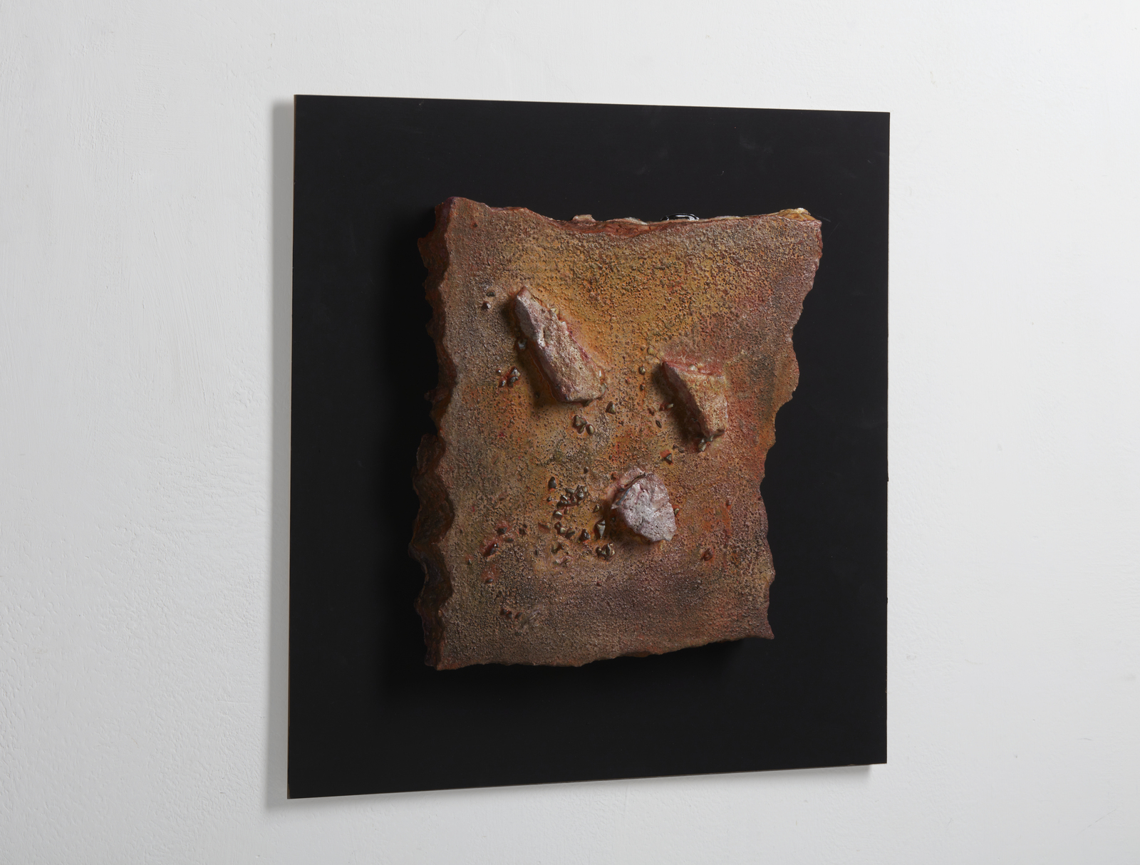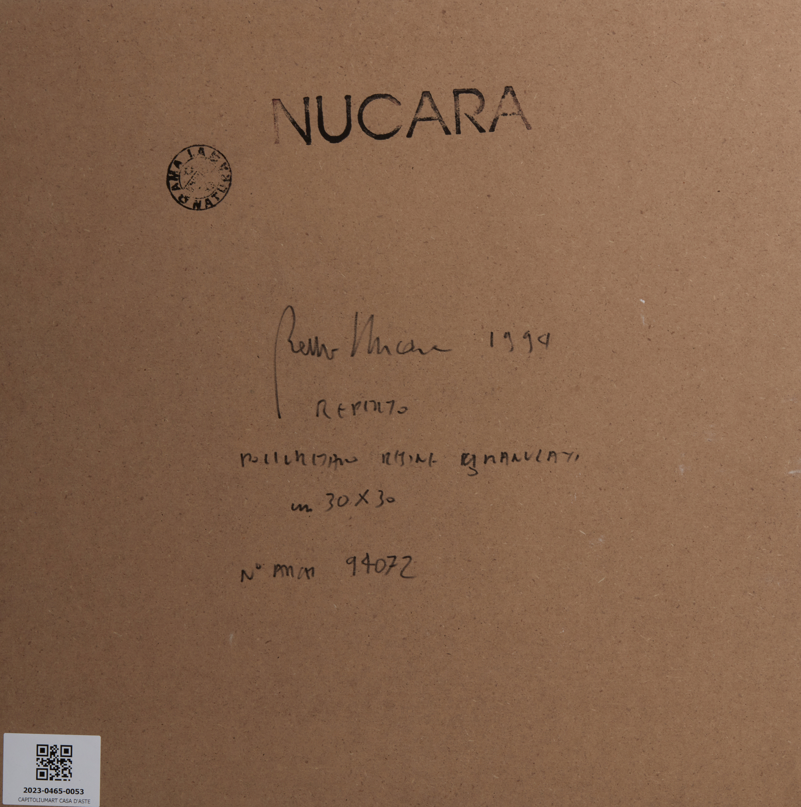 NUCARA RENZO (n. 1955) Reperto. . 1994. Tecnica mista su poliuretano. Cm 30,00 x 30,00. Al retro titolo, firma e anno. Autentica dell'artista su fotografia. Cornice presente