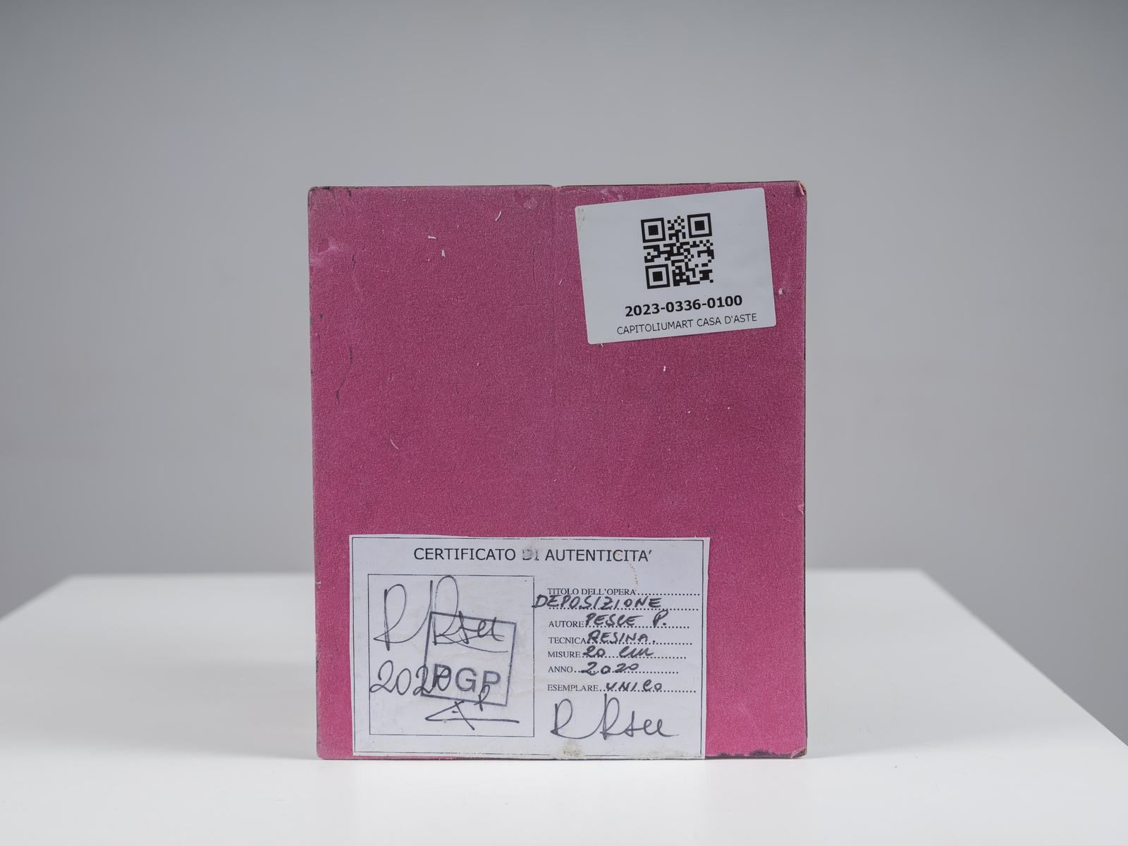 PESCE PIERGIUSEPPE (n. 1965) Deposizione. 2020. Resina e plastica. Cm 16,50 x 17,00 x 14,00. Cartiglio descrittivo con firma dell'artista sotto la base. Lievi difetti.