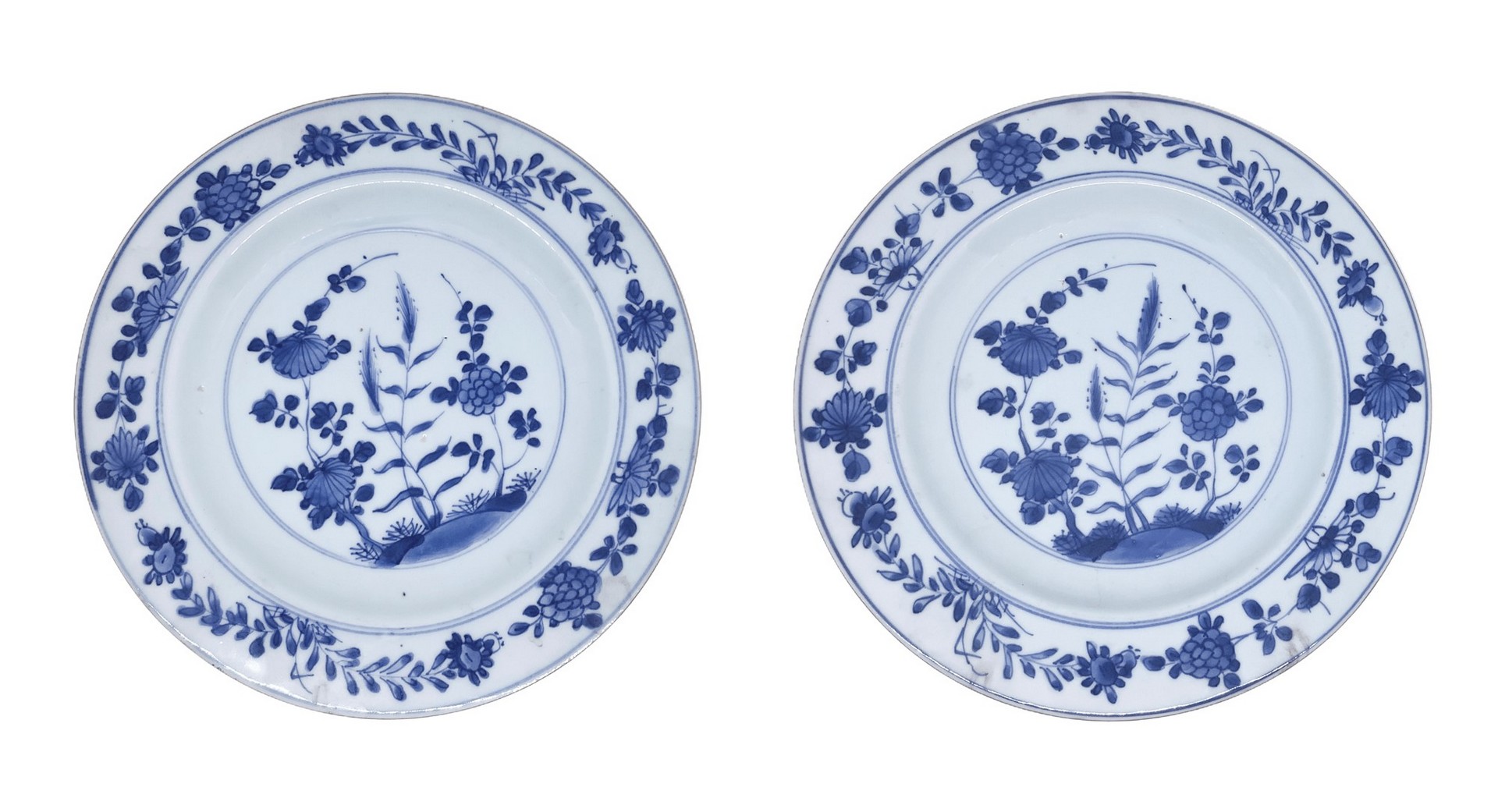 Coppia di piatti con decorazioni floreali nei toni del blu