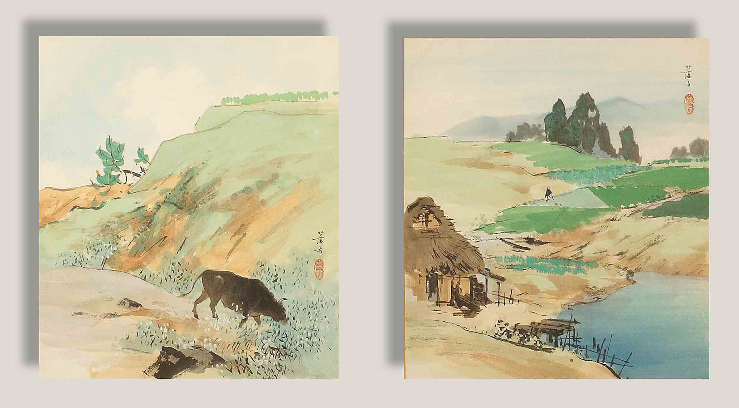 Scuola giapponese del XIX secolo, "Paesaggi", coppia di acquarelli su carta,...