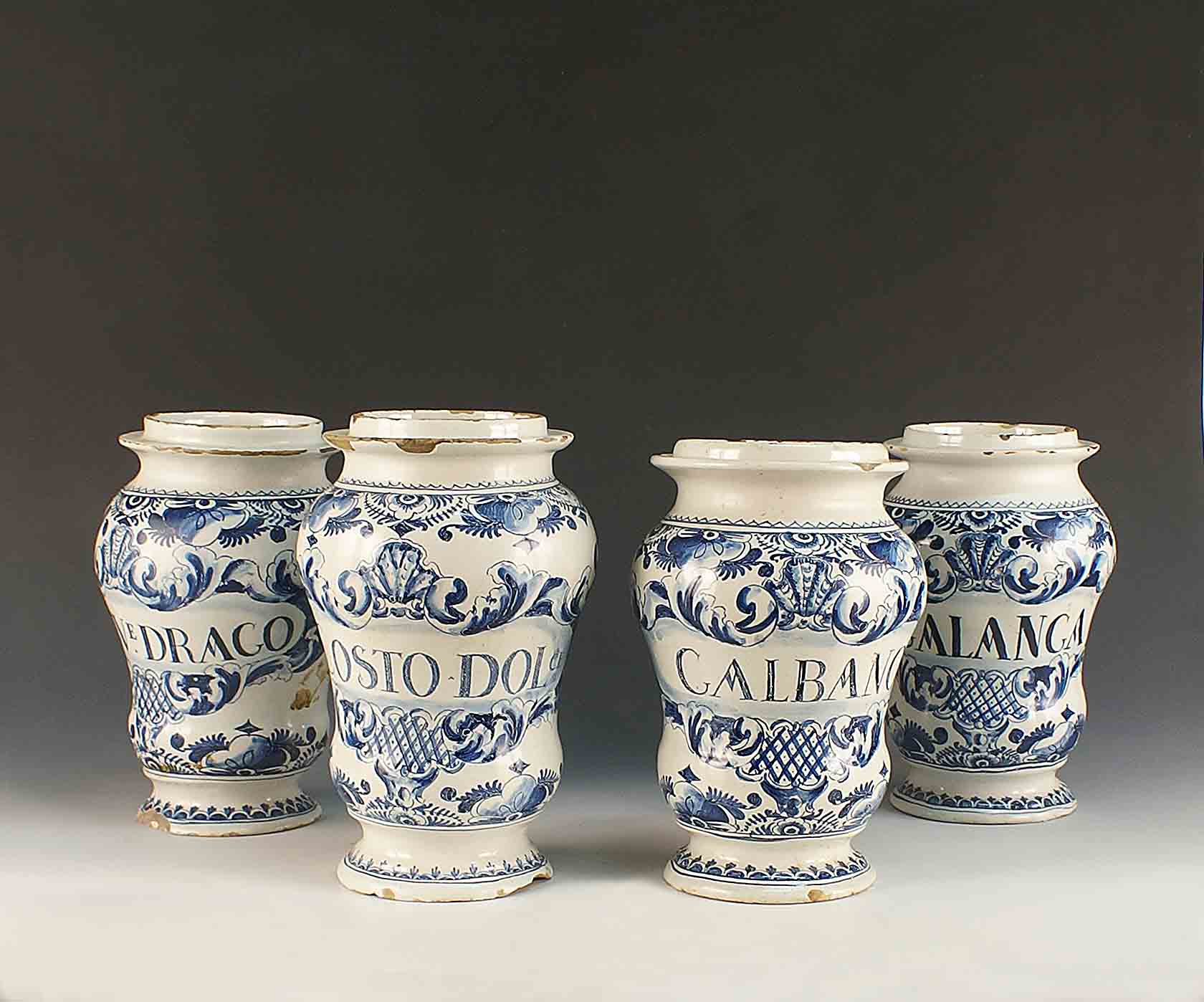 Quattro vasi da farmacia in maiolica a fondo bianco dipinta nella tonalità...