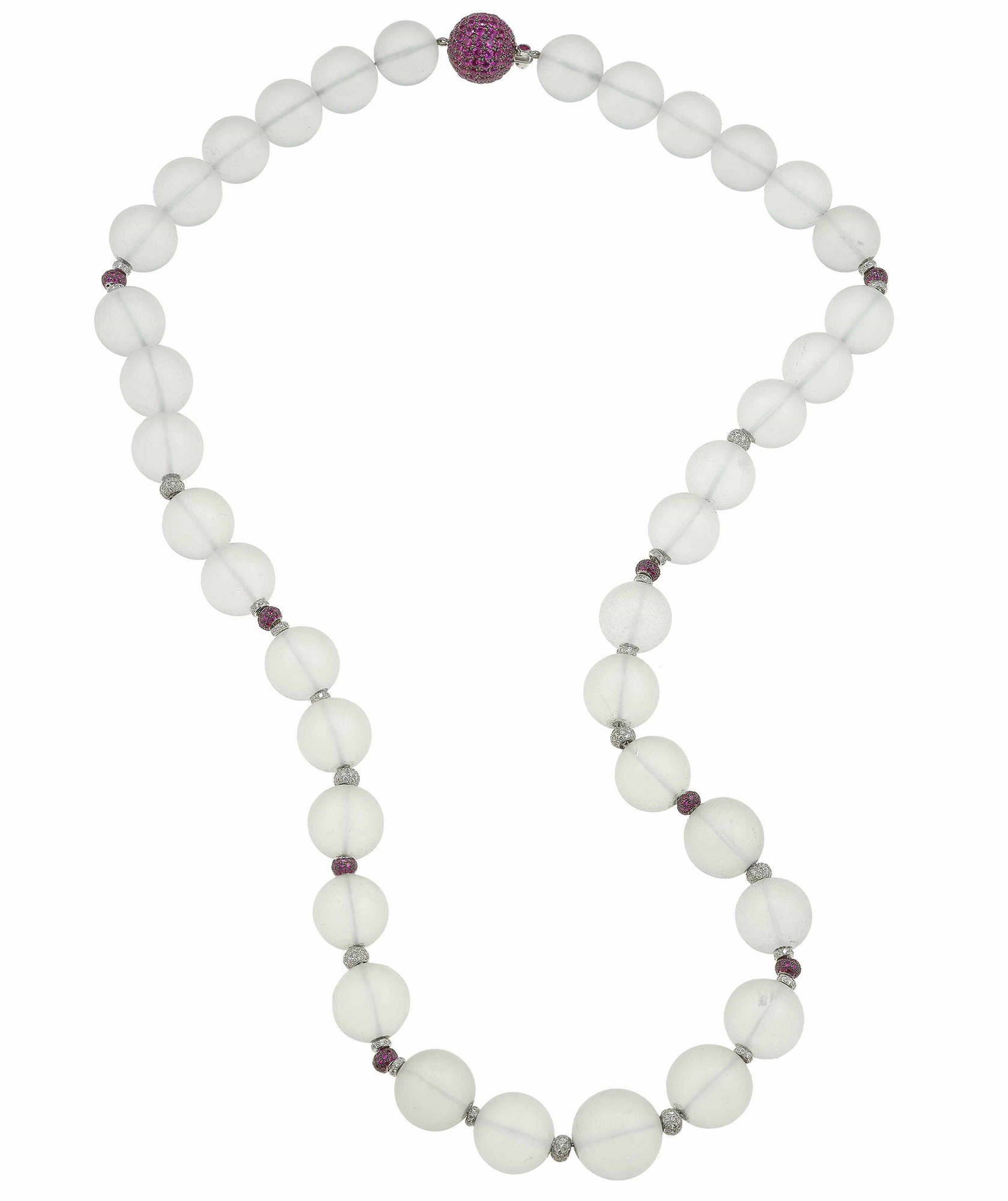 Collana con cristallo di rocca sabbiato, rubini e diamanti