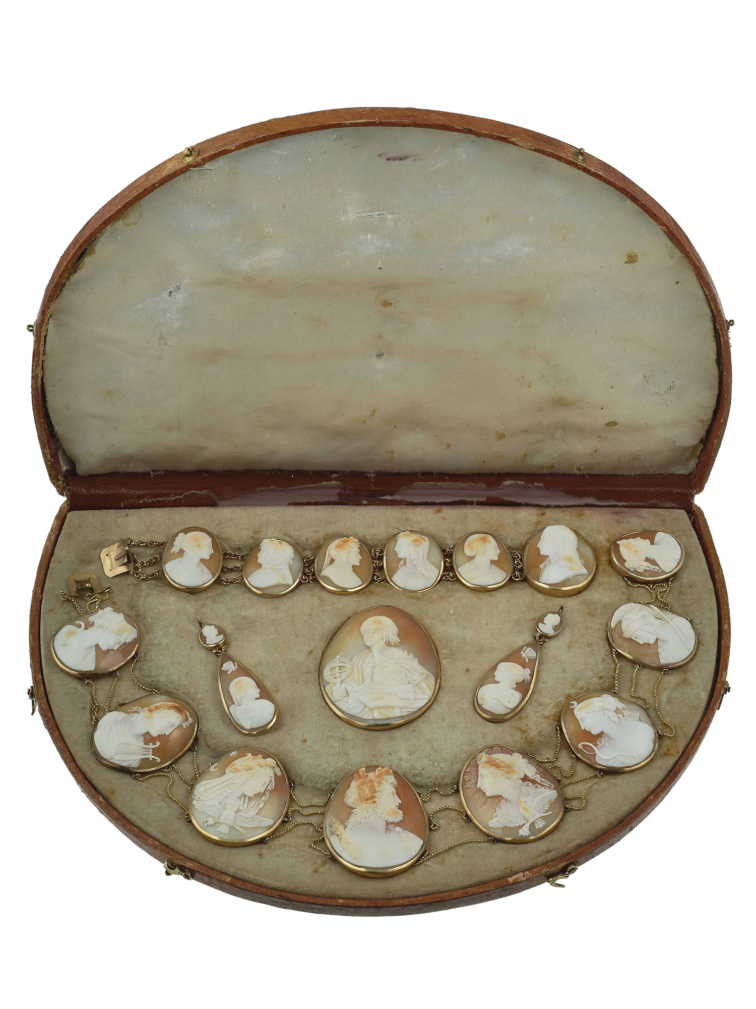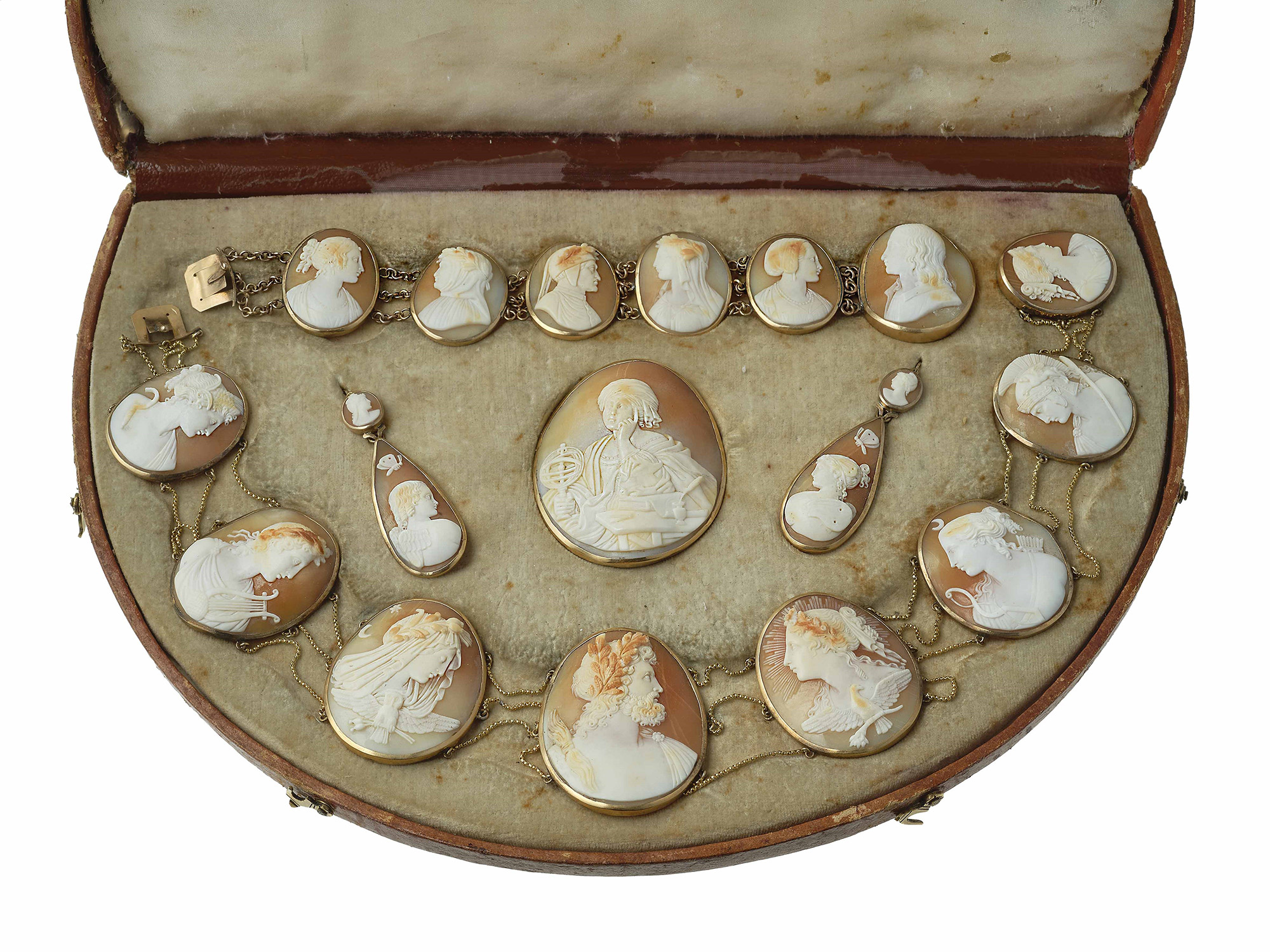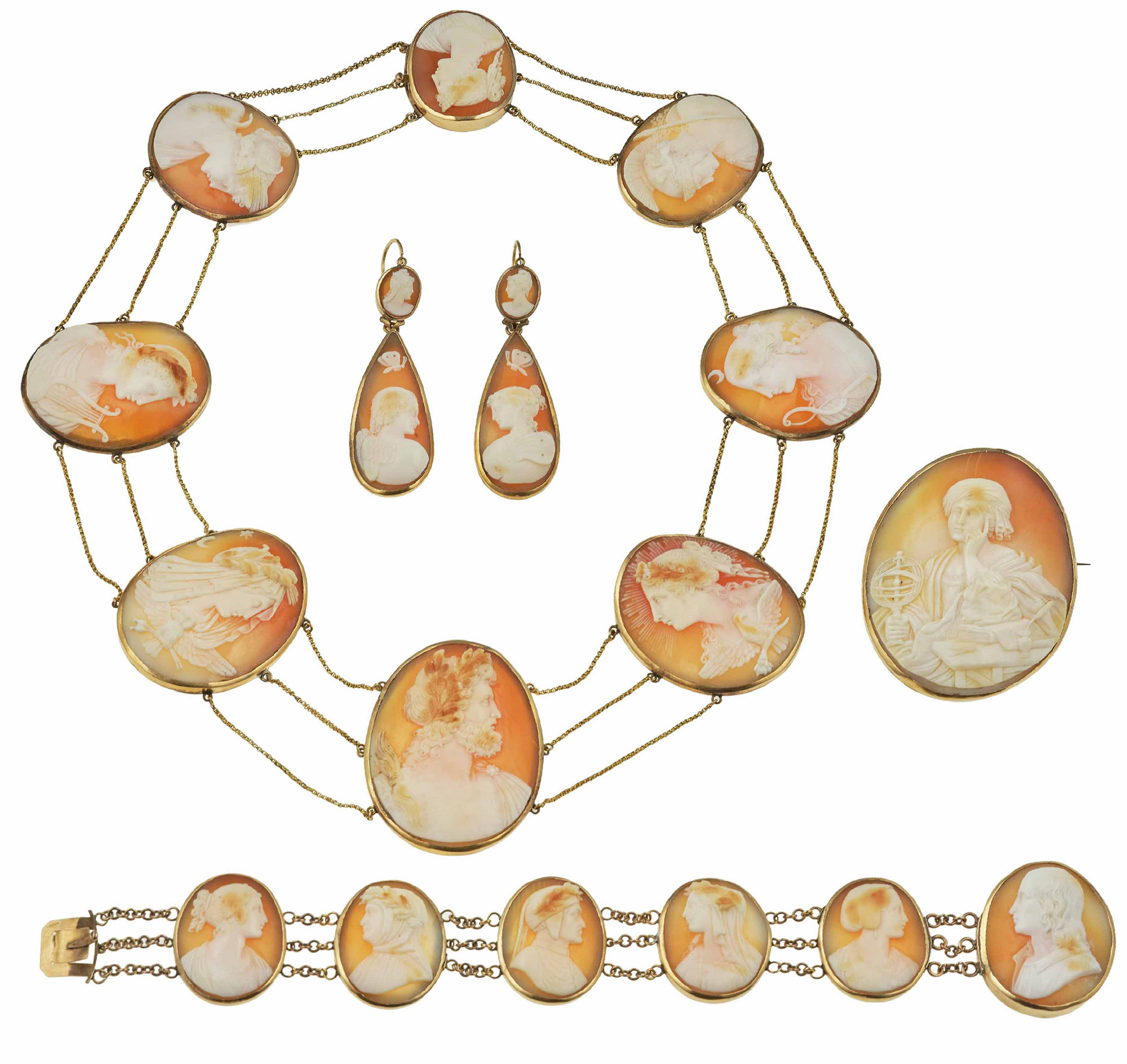 Parure composta da girocollo, bracciale, orecchini e spilla con cammei in conchiglia