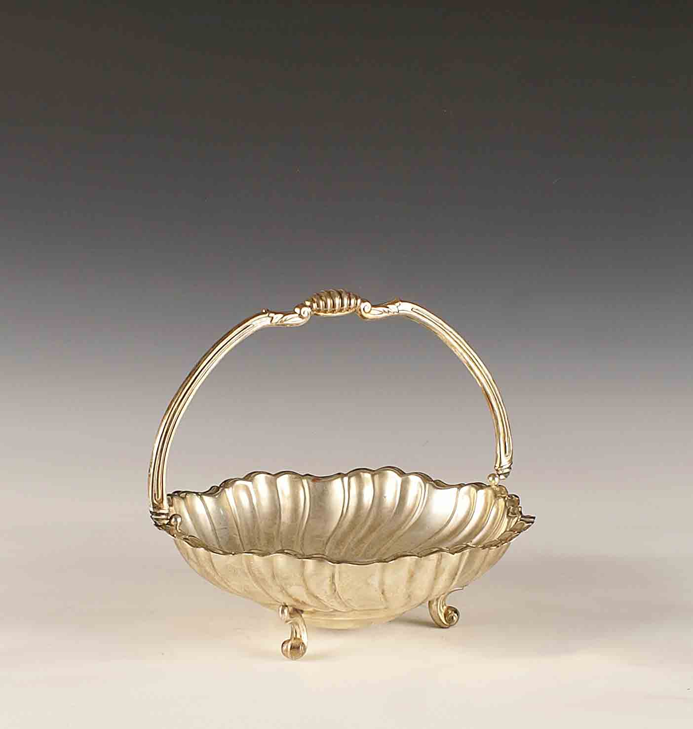 Cesto con manico in argento poggiante su tre piedini, vecchia manifattura, gr. 280.