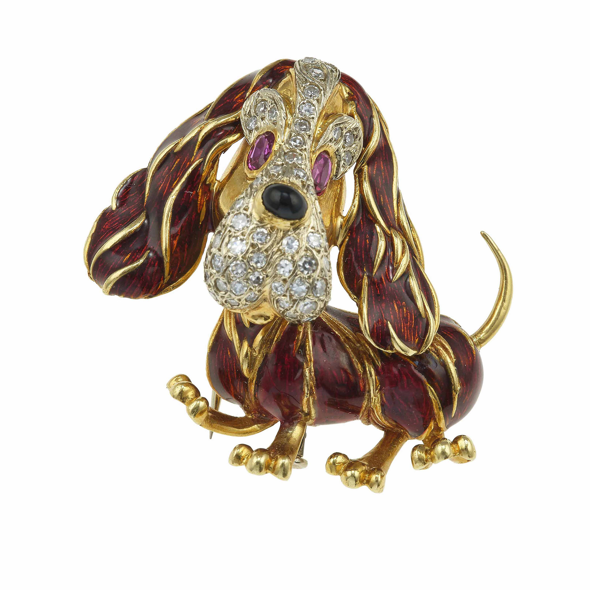 Frascarolo. Spilla "cane" con smalti, diamanti e rubini