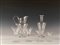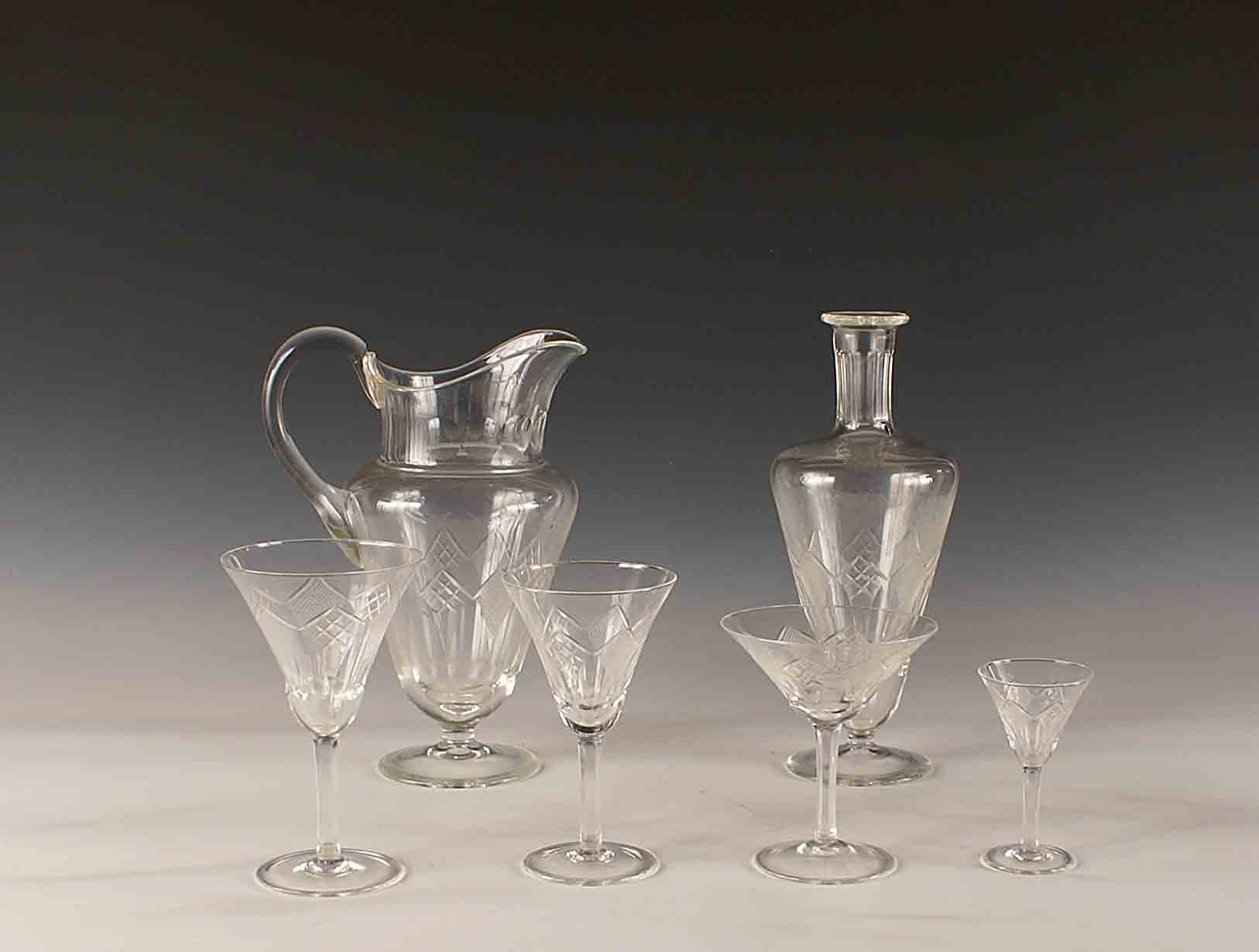 Servizio di bicchieri in vetro composto da 10 bicchieri acqua, 10 bicchieri vino, 10 coppe champagne, 10 bicchieri liquore, 2 caraffe acqua e 2 bottiglie vino.