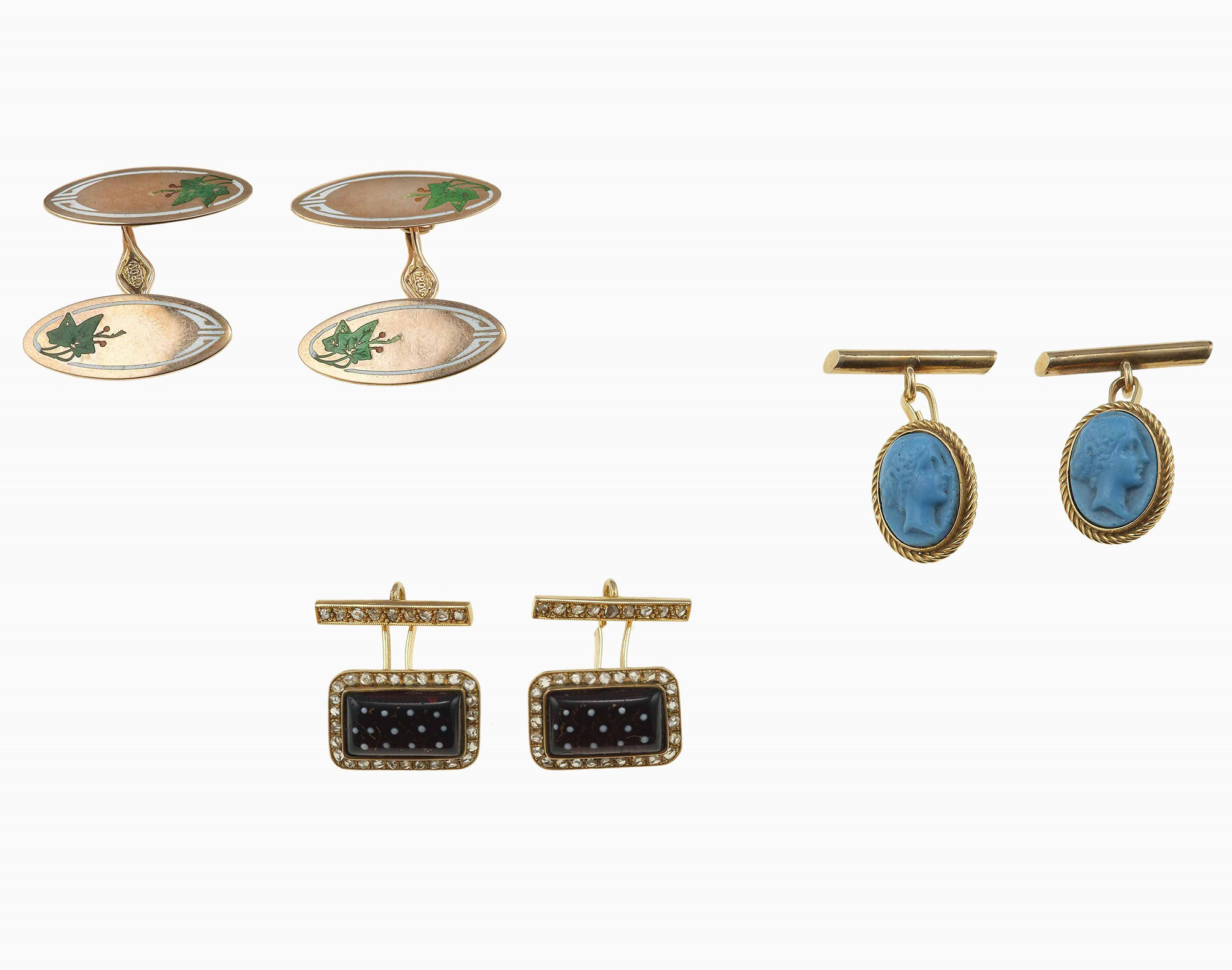 Lotto 390 | Lotto composto da tre paia di bottoni da polso con smalti policromi, vetro opalino e granati