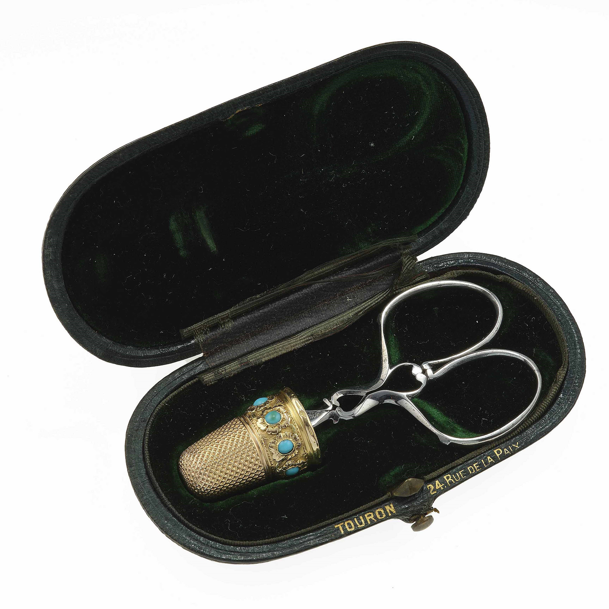 Set da cucito con ditale in oro 750/1000 e turchesi, mancanze