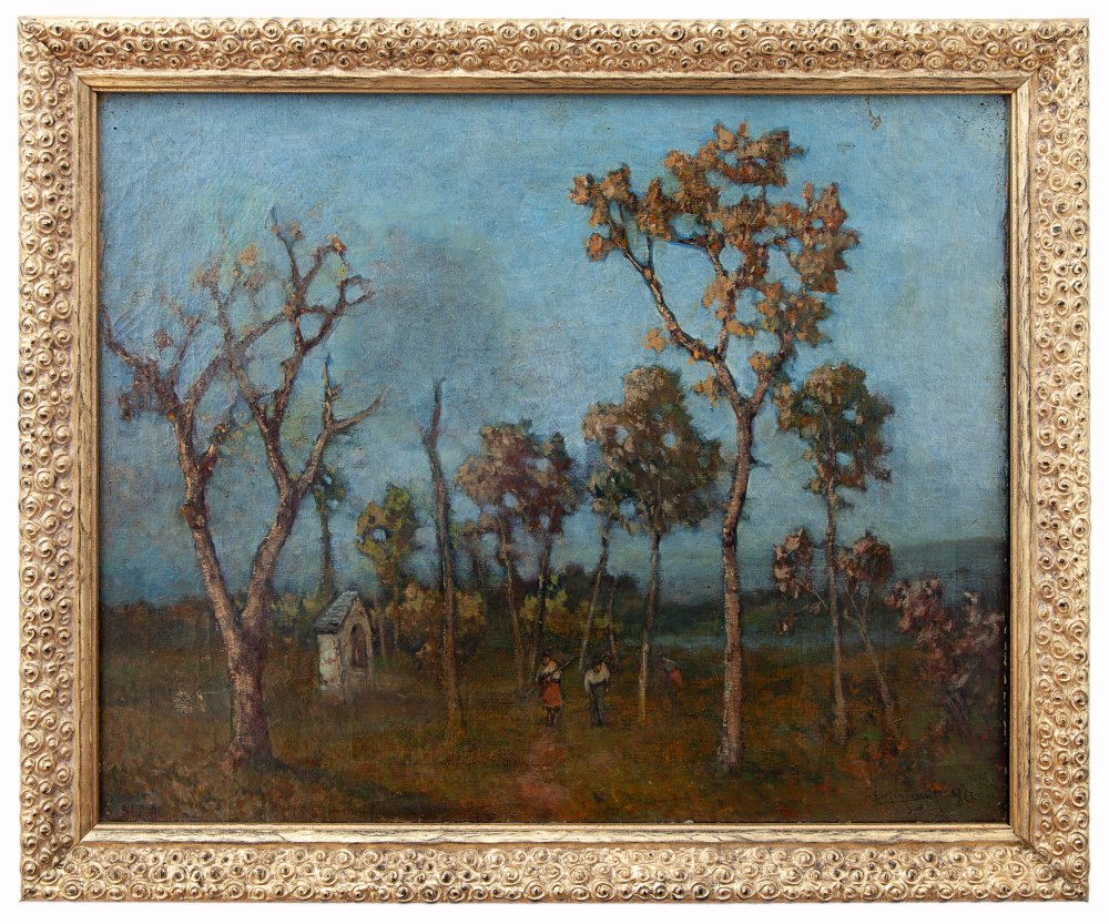 Lorenzo Gignous Modena 1862 - Porto Ceresio (VA) 1958 Paesaggio con figure Olio su tela cm 48x61