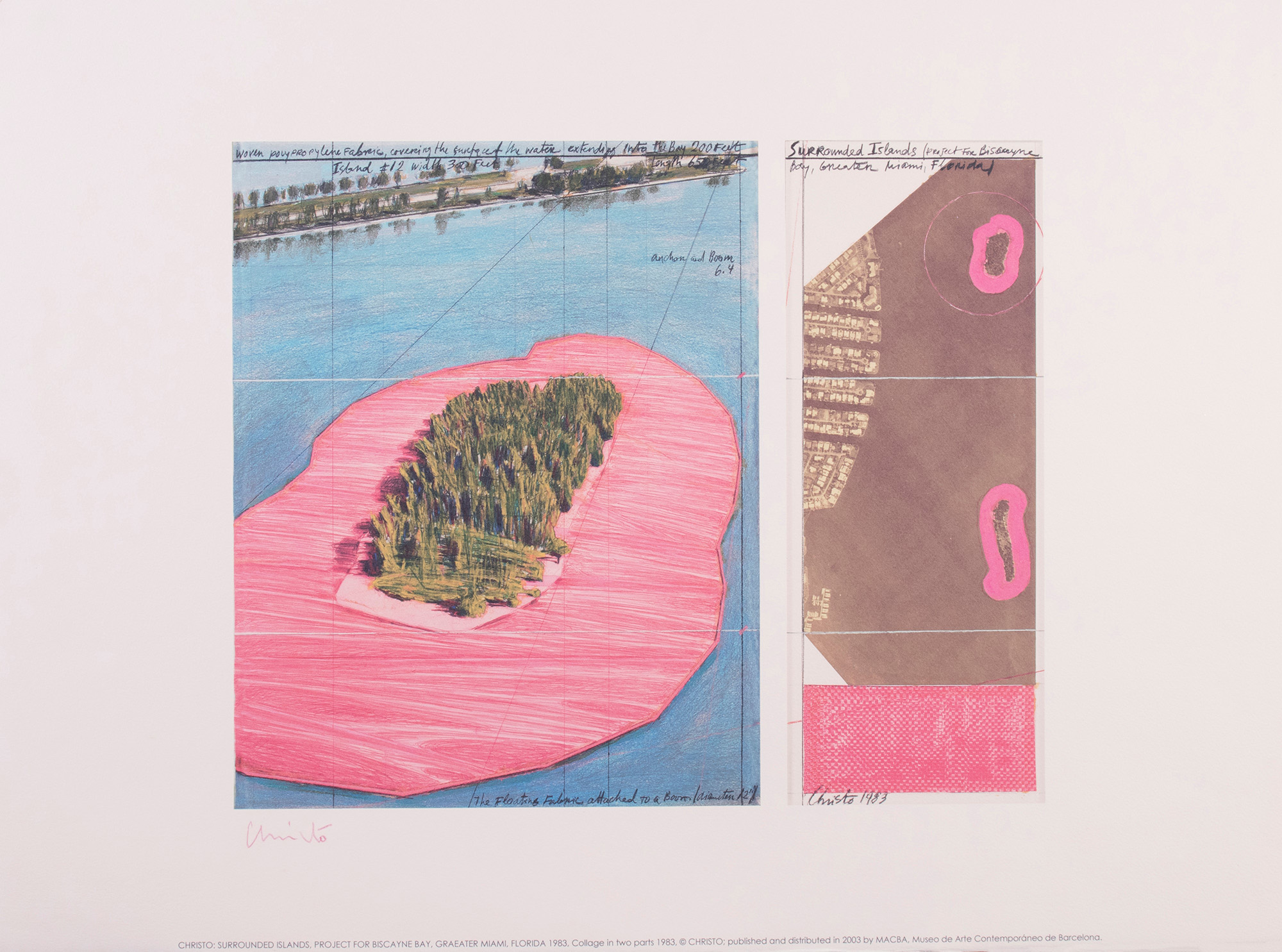 Firma in basso a sinistra: Christo, firma e data in lastra in basso a destra: Christo 1983, scritta a stampa in basso: Christo: Surrounded Islands, Project for Biscayne Bay, Greater Miami, Florida, 1983, Collage in two parts 1983, © Christo; published and distributed in 2003 by MACBA, Museo de Arte Contemporáneo de Barcelona.