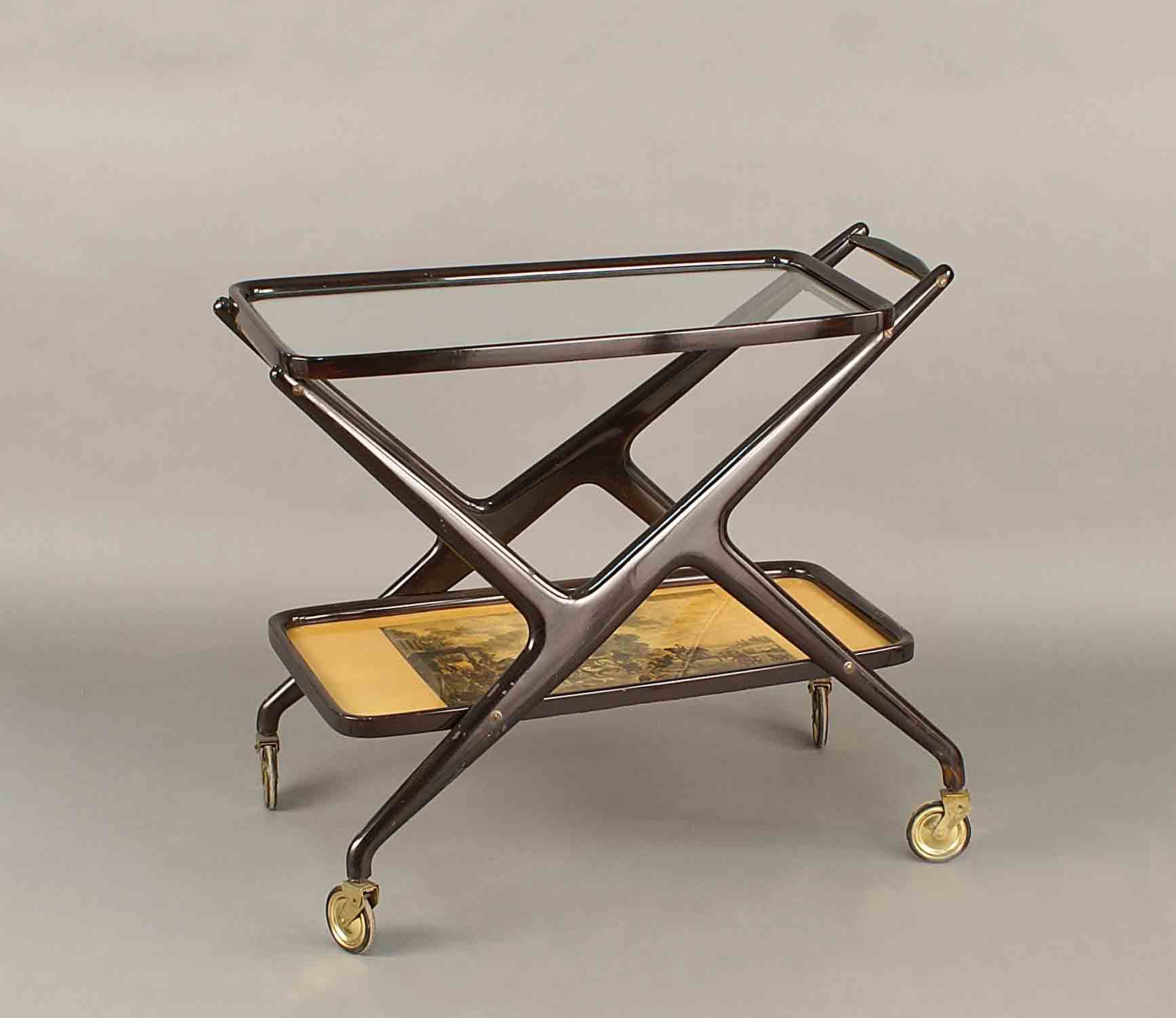 Carrello portavivande in legno a due ripiani di cui uno decorato con una stampa raffigurante un paesaggio francese, provvisto di rotelle, anni '50, cm. 71x84x41.
