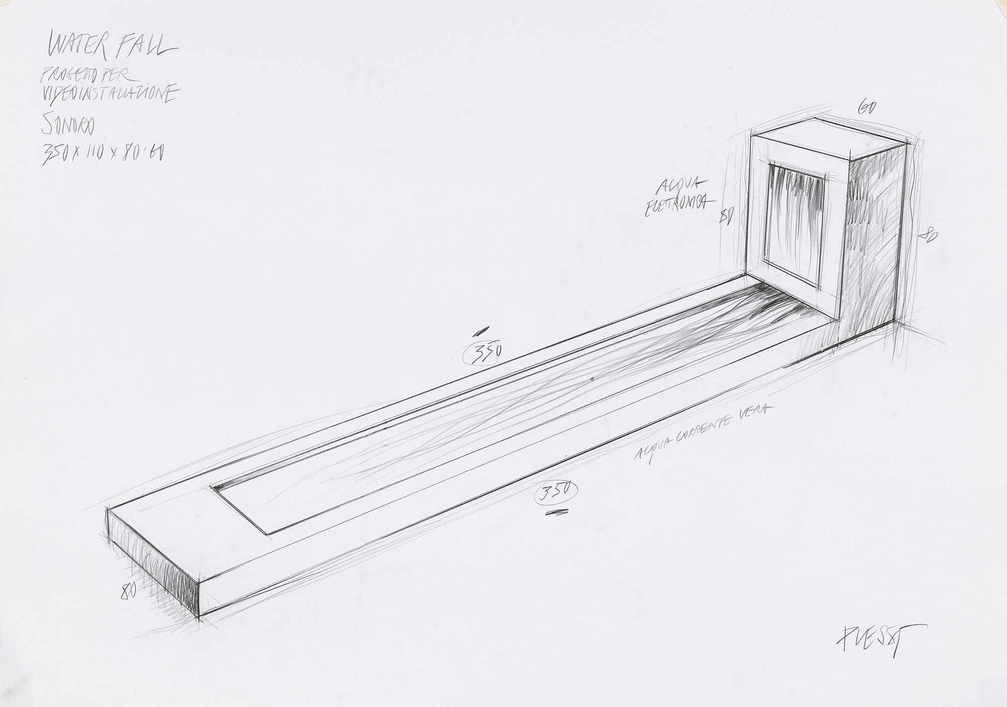 Firma in basso a destra: Plessi, titolo in alto a sinistra: Water Fall / progetto per / videoinstallazione / sonoro.