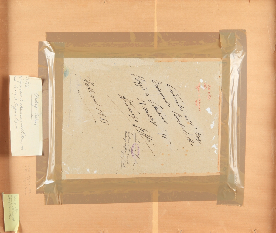 sul retro: dichiarazione di cessione con firma e data autografa dell'artista e timbro con firma galleria Rinaldo Rotta, Genova