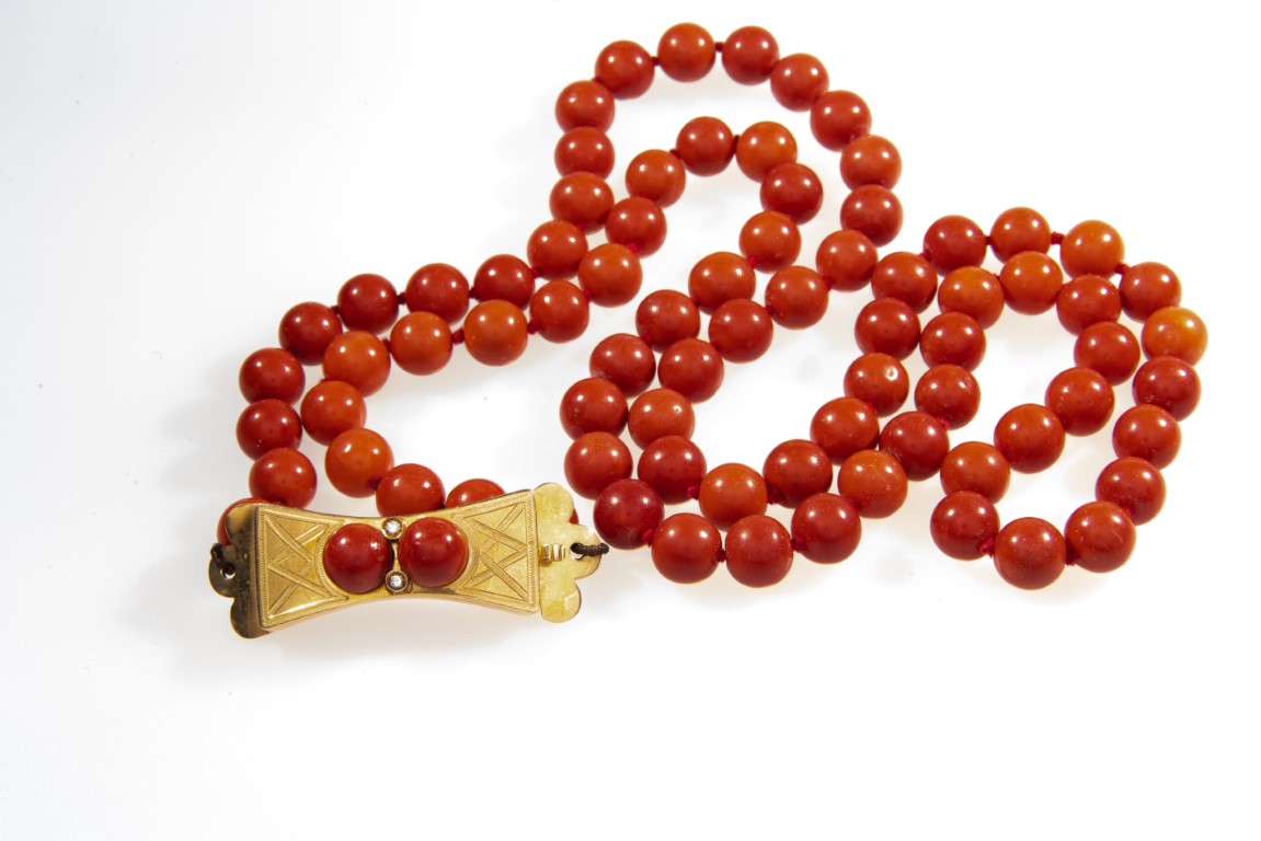 montata in oro 750, realizzata con sfere di corallo naturale rosso intenso