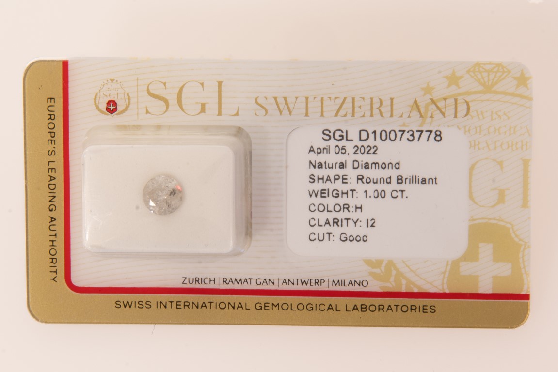 Taglio brillante, di colore H e purezza I2, in blister sigillato con certificazione SLG Switzerland